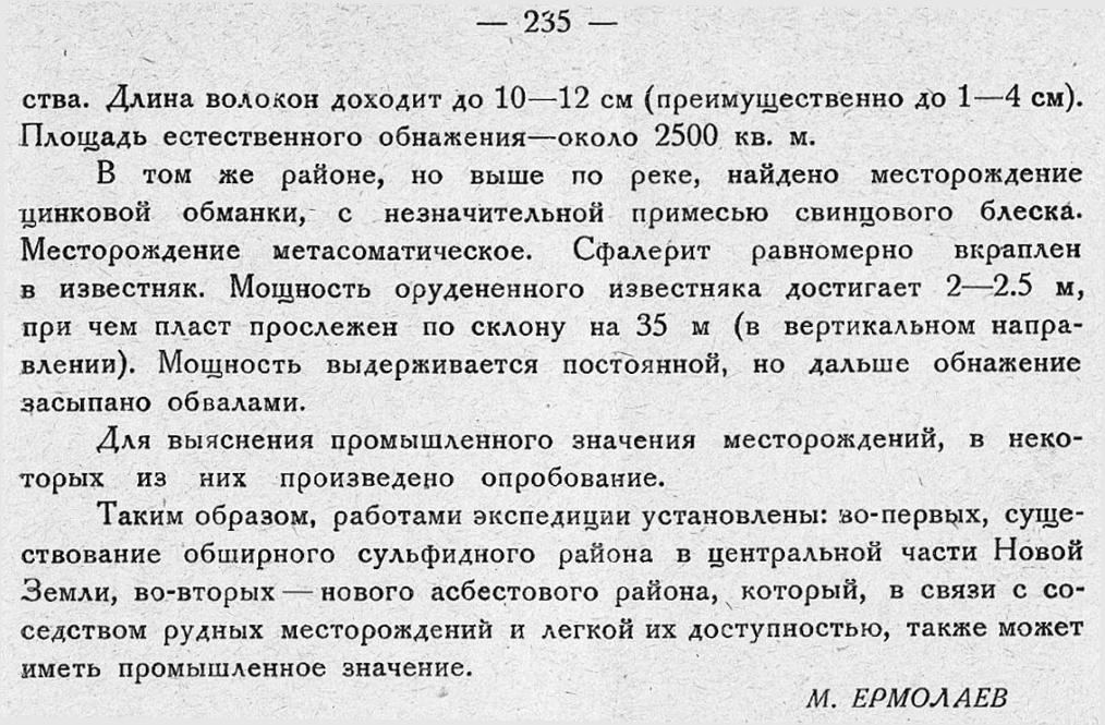 Таким образом, работами экспедиции установлены: во-первых, существование обширного сульфидного района в центральной части Новой Земли, во-вторых — нового асбестового района, который, в связи с соседством рудных месторождений и легкой их доступностью, также может иметь промышленное значение.