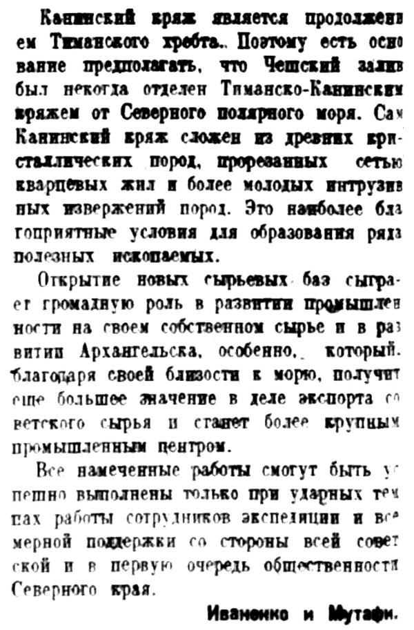Все намеченные работы смогут быть успешно выполнены только при ударных темпах работы сотрудников экспедиции и всемерной поддержки со стороны всей советской и р первую очередь общественности Северного края.