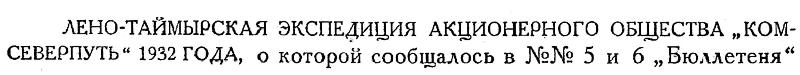 ЛЕНО-ТАЙМЫРСКАЯ ЭКСПЕДИЦИЯ АКЦИОНЕРНОГО ОБЩЕСТВА „КОМСЕВЕРПУТЬ“ 1932 ГОДА, о которой сообщалось в №№ 5 и 6 „Бюллетеня" Арктического института за 1932 г., не состоялась, вследствие неготовности к сроку строившихся в Киренске (на р. Лене) моторно-парусных ботов.