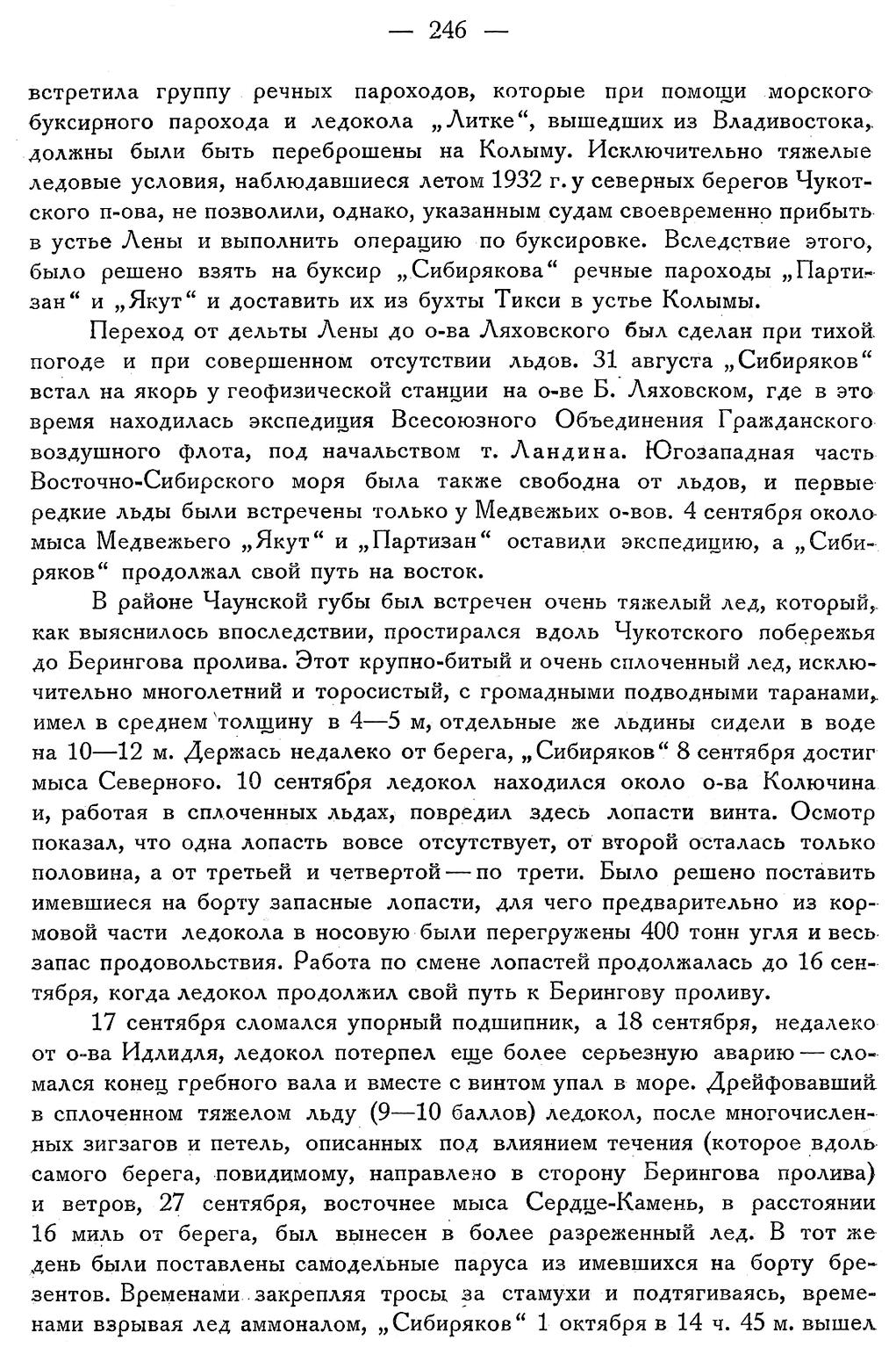 17 сентября сломался упорный подшипник, а 18 сентября, недалеко от о-ва Идлидля, ледокол потерпел еще более серьезную аварию — сломался конец гребного вала и вместе с винтом упал в море. Дрейфовавший в сплоченном тяжелом льду (9—10 баллов) ледокол, после многочисленных зигзагов и петель, описанных под влиянием течения (которое вдоль самого берега, повидимому, направлено в сторону Берингова пролива) и ветров, 27 сентября, восточнее мыса Сердце-Камень, в расстоянии 16 миль от берега, был вынесен в более разреженный лед. В тот же день были поставлены самодельные паруса из имевшихся на борту брезентов. Временами закрепляя тросы за стамухи и подтягиваясь, временами взрывая лед аммоналом, „Сибиряков“ 1 октября в 14 ч. 45 м. вышел