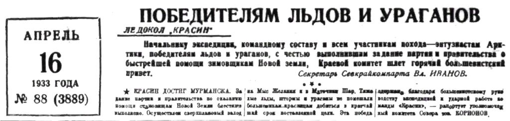 Большое значение результатов зимней экспедиции на „Красине“ было отмечено приветствием тт. Сталина, Молотова, Ворошилова и Янсона, которыми возбуждено ходатайство перед правительством и партией о награждении участников экспедиции на „Красине".