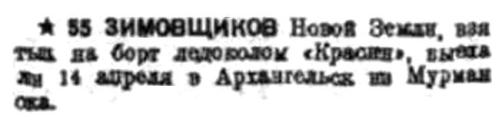 После снабжения cтановища в заливе Адмиралтейства „Красин“ 25 марта направился в губу Архангельскую, куда пришел на следующий день.