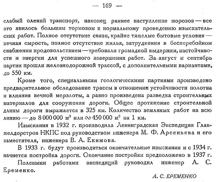 ЖЕЛЕЗНОДОРОЖНАЯ ЛИНИЯ ЮГОРСКИЙ ШАР - ВОРКУТА. {1} Работы по исследованию железнодорожного пути Югорский Шар — Воркута и некоторые подготовительные велись истекшим летом группой сотрудников НКПС, под начальством инженера А. С. Еременко. По полученным сведениям, полевые работы закончились 27 сентября, и группа выехала в Ленинград. В результате работ последнего сезона выбраны места для постройки железнодорожной станции и разъездов, угольных складов, пакгаузов, место для аэропорта и пр. и начаты подготовительные работы по устройству морского порта в конечном пункте железной дороги. Выяснено, что удобным пунктом для порта следует считать местность вблизи сел. Хабарова, хорошо защищенную от преобладающих ветров и льдов, приходящих со стороны Баренцова моря.