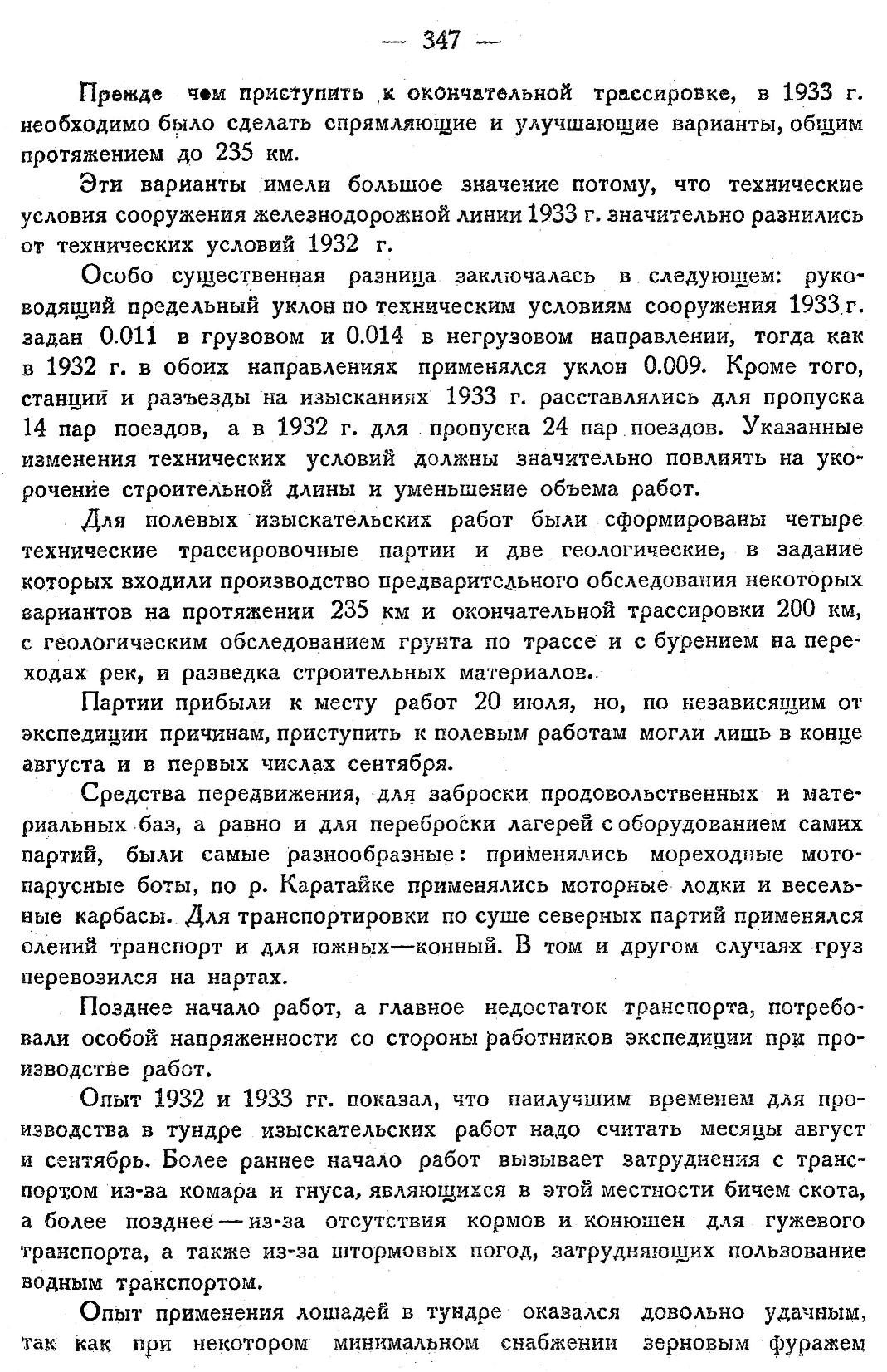 Опыт 1932 и 1933 гг. показал, что наилучшим временем для производства в тундре изыскательских работ надо считать месяцы август и сентябрь. Более раннее начало работ вызывает затруднения с транспортом из-за комара и гнуса, являющихся в этой местности бичом скота, а более позднее — из-за отсутствия кормов и конюшен для гужевого транспорта, а также из-за штормовых погод, затрудняющих пользование водным транспортом.