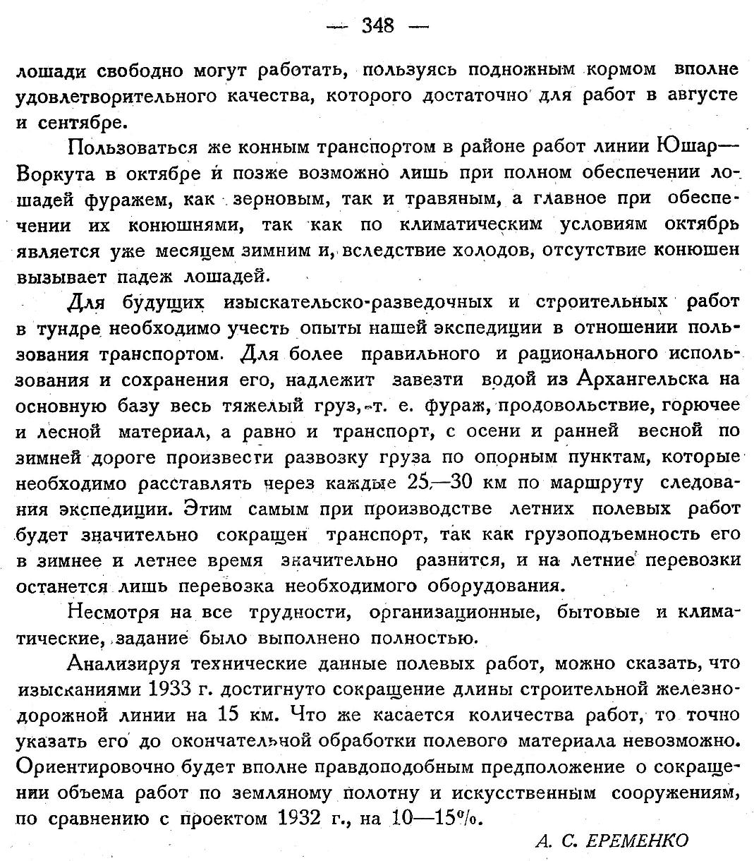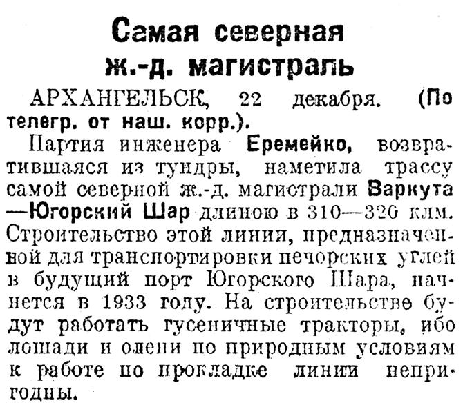 Партия инженера Еремен[й]ко, возвратившаяся из тундры, наметила трассу самой северной ж. -д. магистрали Во[а]ркута — Югорский Шар длиною в 310—320 клм. Строительство этой линии, предназначенной для транспортировки печорских углей в будущий порт Югорского Шара, начнется в 1933 году. На строительстве будут работать гусеничные тракторы, ибо лошади и олени по природным условиям к работе по прокладке линия непригодны.