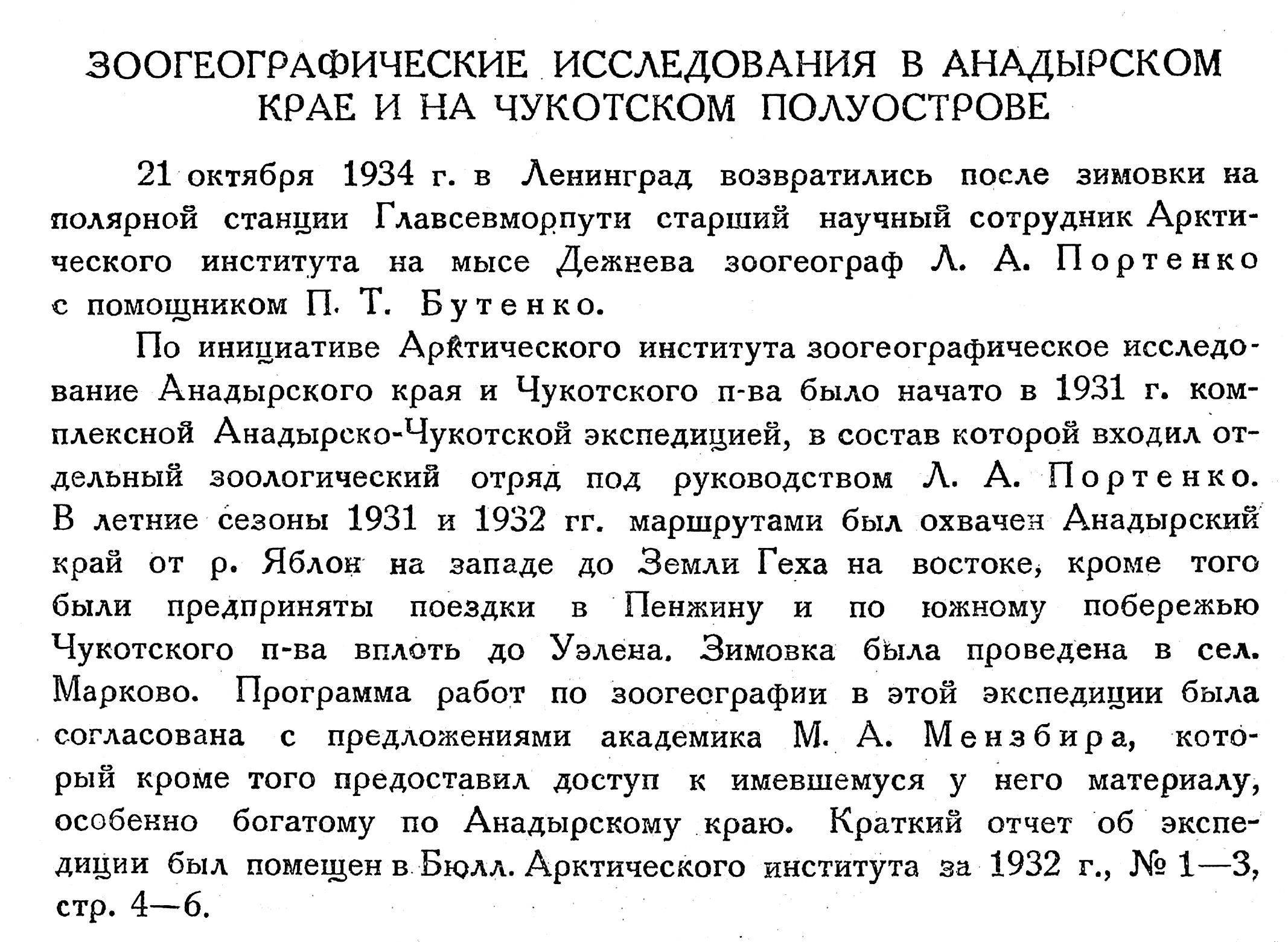 По инициативе Арктического института зоогеографическое исследование Анадырского края и Чукотского п-ва было начато в 1931 г. комплексной Анадырско-Чукотской экспедицией, в состав которой входил отдельный зоологический отряд под руководством Л. А. Портенко. В летние сезоны 1931 и 1932 гг. маршрутами был охвачен Анадырский край от р. Яблон на западе до Земли Геха на востоке, кроме того были предприняты поездки в Пенжину и по южному побережью Чукотского п-ва вплоть до Уэлена. Зимовка была проведена в сел. Марково. Программа работ по зоогеографии в этой экспедиции была согласована с предложениями академика М. А. Мензбира, который кроме того предоставил доступ к имевшемуся у него материалу, особенно богатому по Анадырскому краю. Краткий отчет об экспедиции был помещен в Бюлл. Арктического института за 1932 г., №1—3, стр. 4—6.