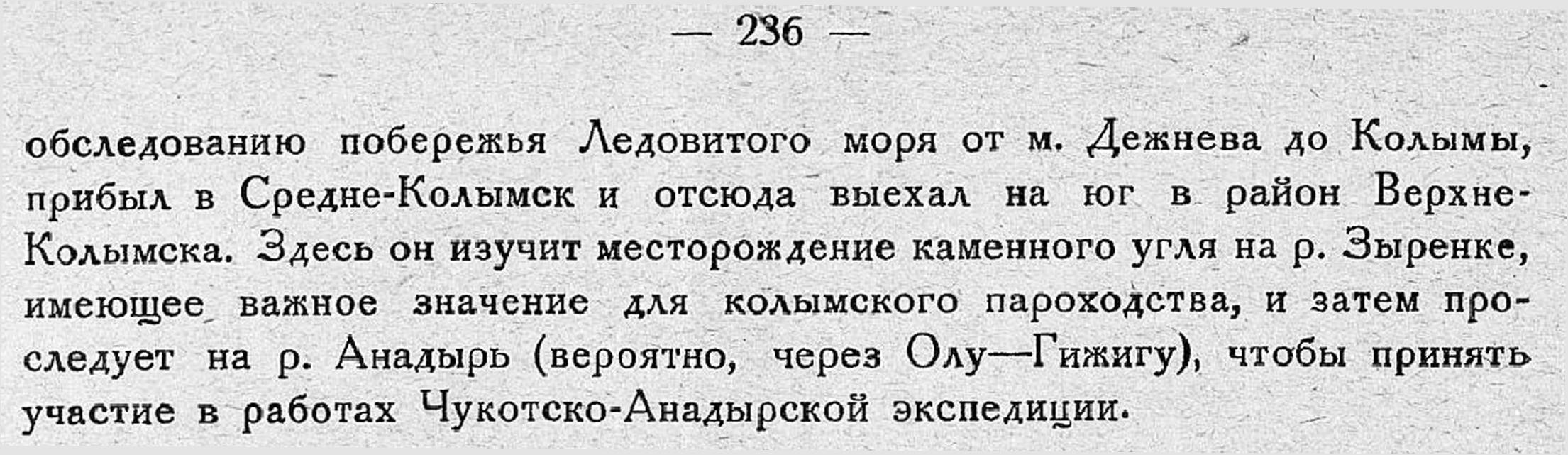 Геолог института С. Г. Павлов, работавший вместе с экспедицией Всесоюзного объединения Гражданского воздушного флота по обследованию побережья Ледовитого моря от м. Дежнева до Колымы, прибыл в Средне-Колымск и отсюда выехал на юг в район Верхне-Колымска. Здесь он изучит месторождение каменного угля на р. Зыренке, имеющее важное значение для колымского пароходства, и затем проследует на р. Анадырь (вероятно, через Олу—Гижигу), чтобы принять участие в работах Чукотско-Анадырской экспедиции.