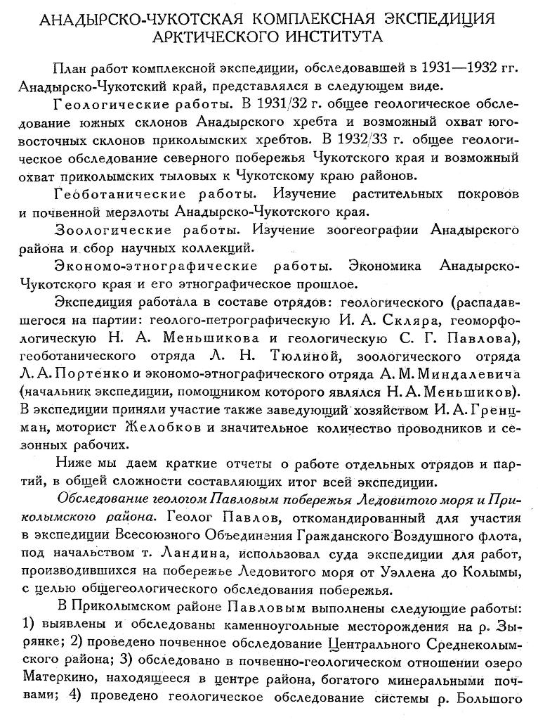 В 1931 г. Арктический институт приступил к комплексному изучению Чукотско-Анадырского края, которое будет продолжаться в течение нескольких лет. Весной этого года в Анадырь выехал первый состав научных работников, который пробудет там до осени 1932 г. В настоящее время экспедиция работает в составе отрядов: экономического (А. М. Миндалевич), ботанического (Л. Н. Тюлина), зоологического (Л. А. Портенко), геологического (И. А. Скляр) и геоморфологического (Н. А. Меньшиков).