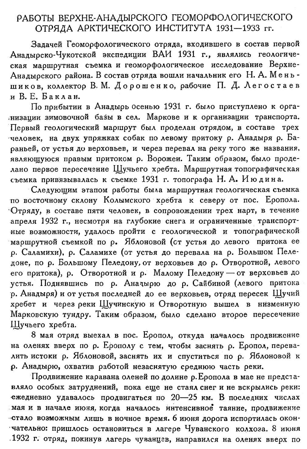 Задачей Геоморфологического отряда, входившего в состав первой Анадырско-Чукотской экспедиции ВАИ 1931 г., являлись геологическая маршрутная съемка и геоморфологическое исследование Верхне-Анадырского района. В состав отряда вошли начальник его Н. А. Меньшиков, коллектор В. М. Дорошенко, рабочие П. Д. Легостаев и В. Е. Баклан.