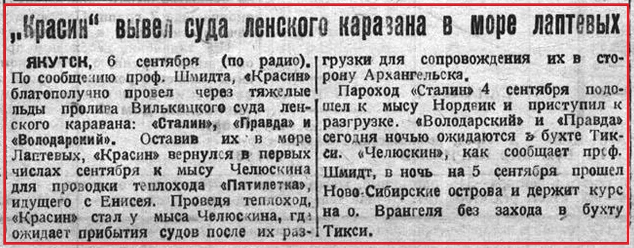 ЯКУТСК, 6 сентября (по радио). По сообщению проф. Шмидта, «Красин» благополучно провел через тяжелые льды пролира Вилькицкого суда ленского каравана: «Сталин», «Правда» и «Володарский». Оставив их в море Лаптевых, «Красин» вернулся в первых числах сентября к мысу Челюскина для проводки теплохода «Пятилетка», идущего с Енисея. Проведя теплоход, «Красин» стал у мыса Челюскина, где ожидает прибытия судов после их разгрузки для сопровождения их в сторону Архангельска.