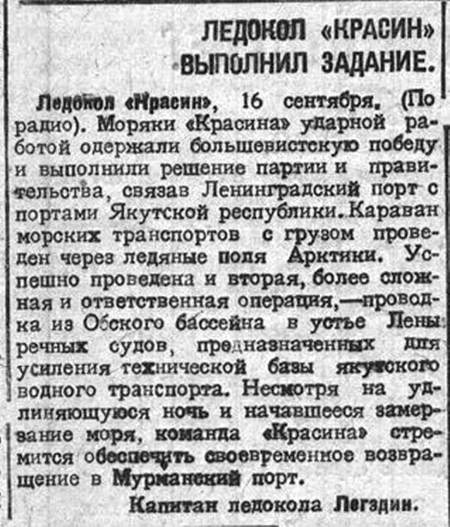 Ледокол «Красин», 16 сентября. (По радио). Моряки «Красина» ударной работой одержали большевистскую победу и выполнили решение партии и правительства, связав Ленинградский порт с портами Якутской республики. Караван морских транспортов с грузом проведен через ледяные поля Арктики. Успешно проведена и вторая, более сложная и ответственная операция, — проводка из Обского бассейна в устье Лены речных судов, предназначенных для усиления технической базы якутского водного транспорта. Несмотря на удлиняющуюся ночь и начавшееся замерзание моря, команда «Красина» стремится обеспечить своевременное возвращение в Мурманский порт.