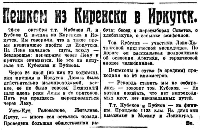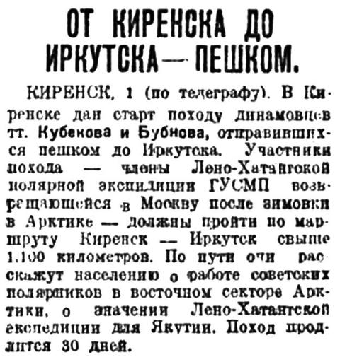 КИРЕНСК. 1 (по телеграфу). В Киренске дан старт походу динамовцев тт. Кубекова и Бубнова, отправившихся пешком до Иркутска. Участники похода — члены Лено-Хатангской полярной экспедиции ГУСМП возвращающиеся в Москву после зимовки в Арктике — должны пройти по маршруту Киренск — Иркутск свыше 1.100 километров. По пути они расскажут населению о работе советских полярников в восточном секторе Арктики, о значении Лено-Хатангской экспедиции для Якутии. Поход продлится 30 дней.
