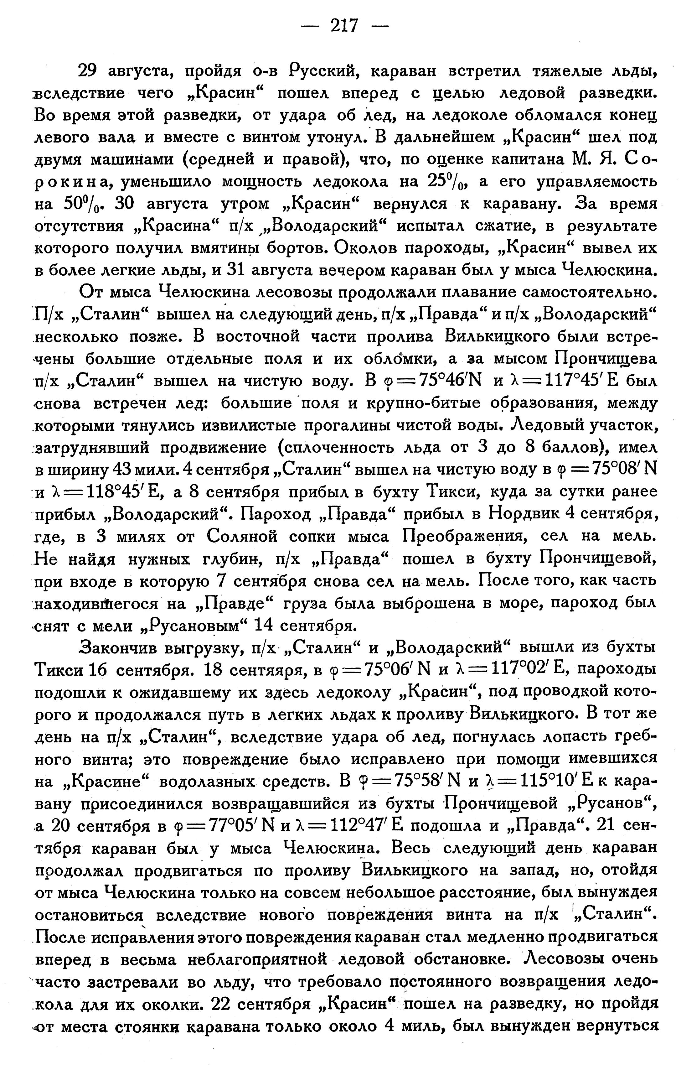 Закончив выгрузку, п/х „Сталин" и „Володарский" вышли из бухты Тикси 16 сентября. 18 сентября, в φ = 75°06'N и λ = 117°02'Е, пароходы подошли к ожидавшему их здесь ледоколу „Красин", под проводкой которого и продолжался путь в легких льдах к проливу Вилькицкого. В тот же день на п/х „Сталин", вследствие удара об лед, погнулась лопасть гребного винта; это повреждение было исправлено при помощи имевшихся на „Красине" водолазных средств. В φ = 75°58'N и λ = 115°10'Е к каравану присоединился возвращавшийся из бухты Прончищевой „Русанов", а 20 сентября в φ = 77°05'N и λ = 112°47'Е подошла и „Правда". 21 сентября караван был у мыса Челюскина. Весь следующий день караван продолжал продвигаться по проливу Вилькицкого на запад, но, отойдя от мыса Челюскина только на совсем небольшое расстояние, был вынужден остановиться вследствие нового повреждения винта на п/х „Сталин". После исправления этого повреждения караван стал медленно продвигаться вперед в весьма неблагоприятной ледовой обстановке. Лесовозы очень часто застревали во льду, что требовало постоянного возвращения ледокола для их околки. 22 сентября „Красин" пошел на разведку, но пройдя от места стоянки каравана только около 4 миль, был вынужден вернуться