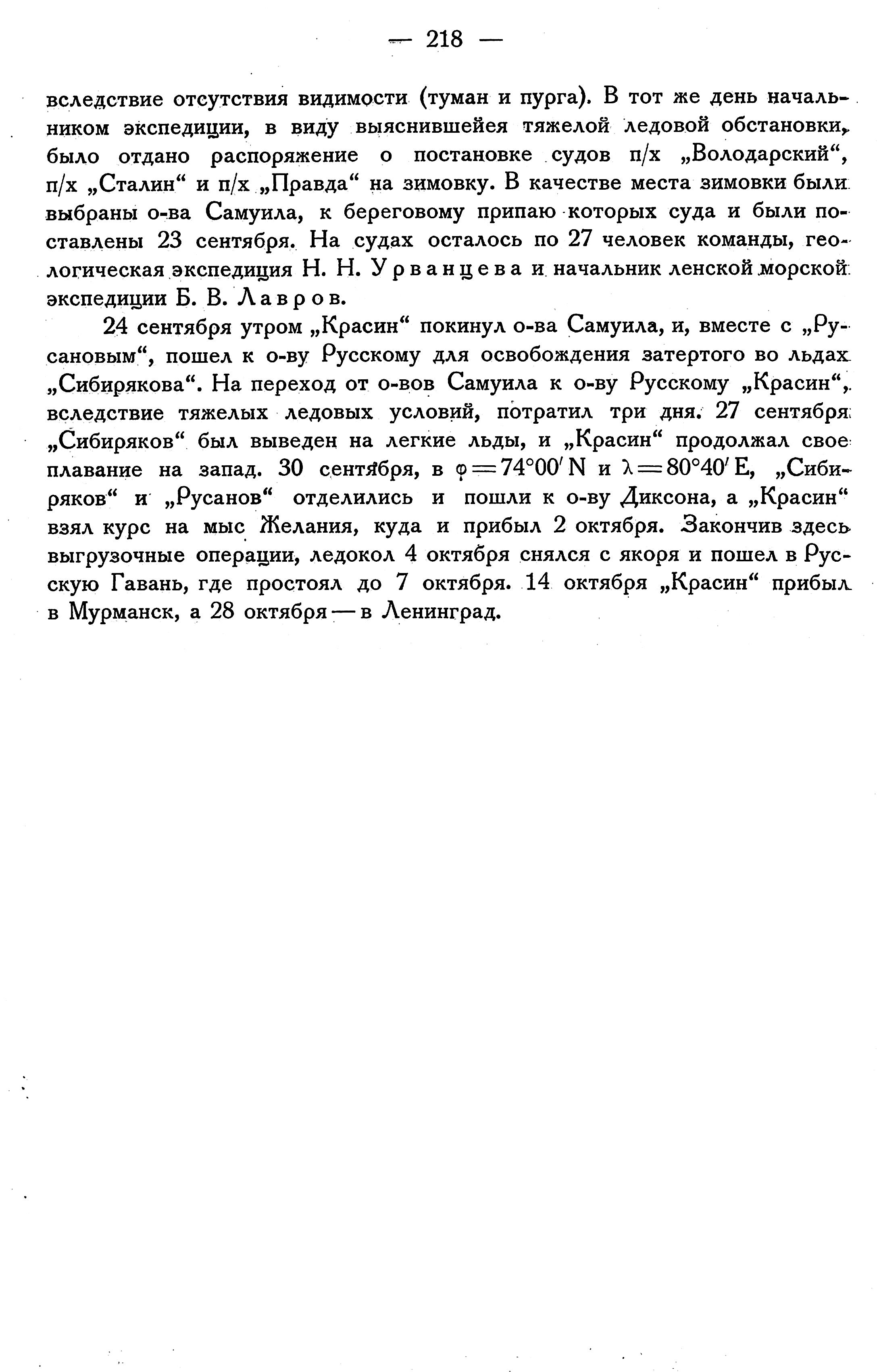 вследствие отсутствия видимости (туман и пурга). В тот же день начальником экспедиции, в виду выяснившейся тяжелой ледовой обстановки, было отдано распоряжение о постановке судов п/х „Володарский", п/х „Сталин" и п/х „Правда" на зимовку. В качестве места зимовки были выбраны о-ва Самуила, к береговому припаю которых суда и были поставлены 23 сентября. На судах осталось по 27 человек команды, геологическая экспедиция Н. Н. Урванцева и начальник ленской морской: экспедиции Б. В. Лавров.