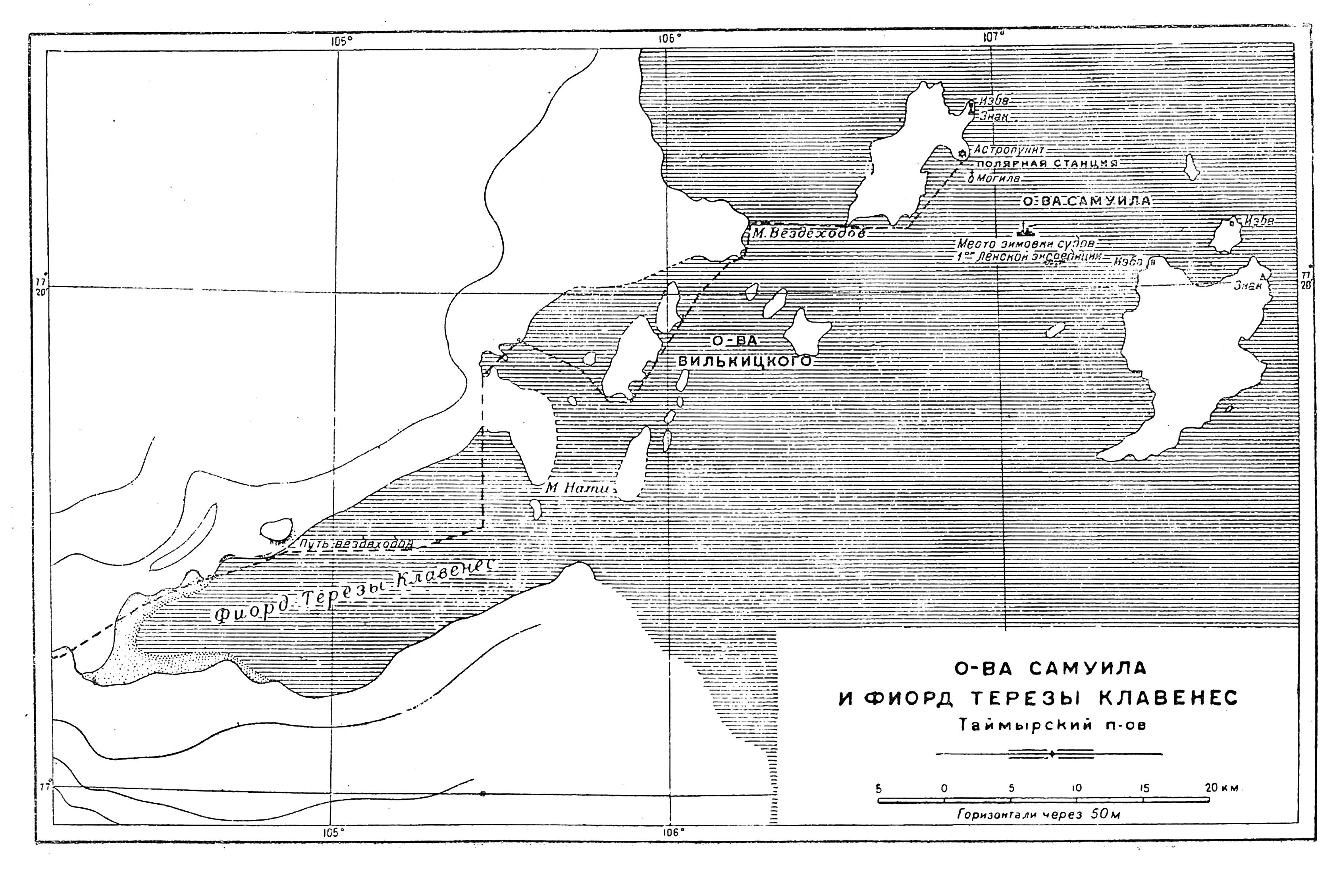 На северовосточных мысах о-вов Западного и Восточного Самуила поставлены гидрографические знаки более 10 м высотою, представляющие четырехногие пирамиды, увенчанные шпилями. На Восточном Самуиле шпиль кончается квадратом, на Западном—треугольником. В трех местах построены промысловые охотничьи домики. Глубины между островами достигают 20—30 и более метров. Но наряду с этим есть и подводные каменные гряды, банки и камни, где глубины падают до 10—5 и менее метров. Повидимому, ряд таких банок и гряд тянется по северной кромке островов в интервале между Западным и Восточным Самуилом, что можно было установить по интенсивному здесь торосообразованию в период зимовки 1933—1934 гг. Образовавшийся мощный ледяной вал и защитил льды пролива, где зимовали суда, от подвижек и нажимов в зимнее время, иначе каравану из слабых корпусами лесовозов едва ли удалось бы уцелеть. Особенно интенсивное нагромождение льдов имелось на 10-м км к ESE от знака Западного Самуила. Промеры глубин в трещинах разрывов льда дали здесь 5—7 м и менее, указывая на наличие каменной банки. Кроме обнаруженных несомненно есть еще банки; так как ледниковое происхождение островов указывает на шхерный характер всего этого района, то плавание в нем должно производиться с большой осмотрительностью.