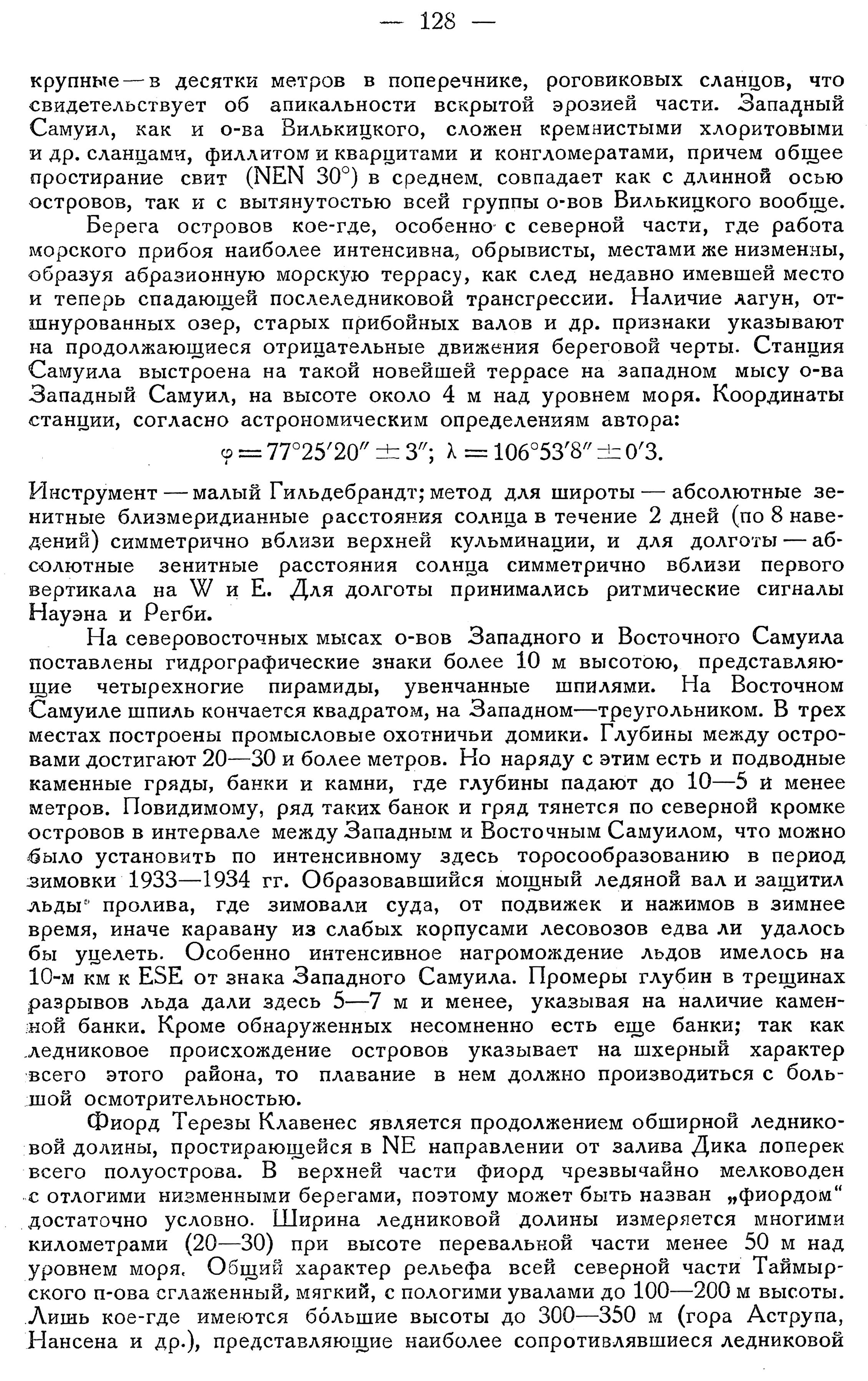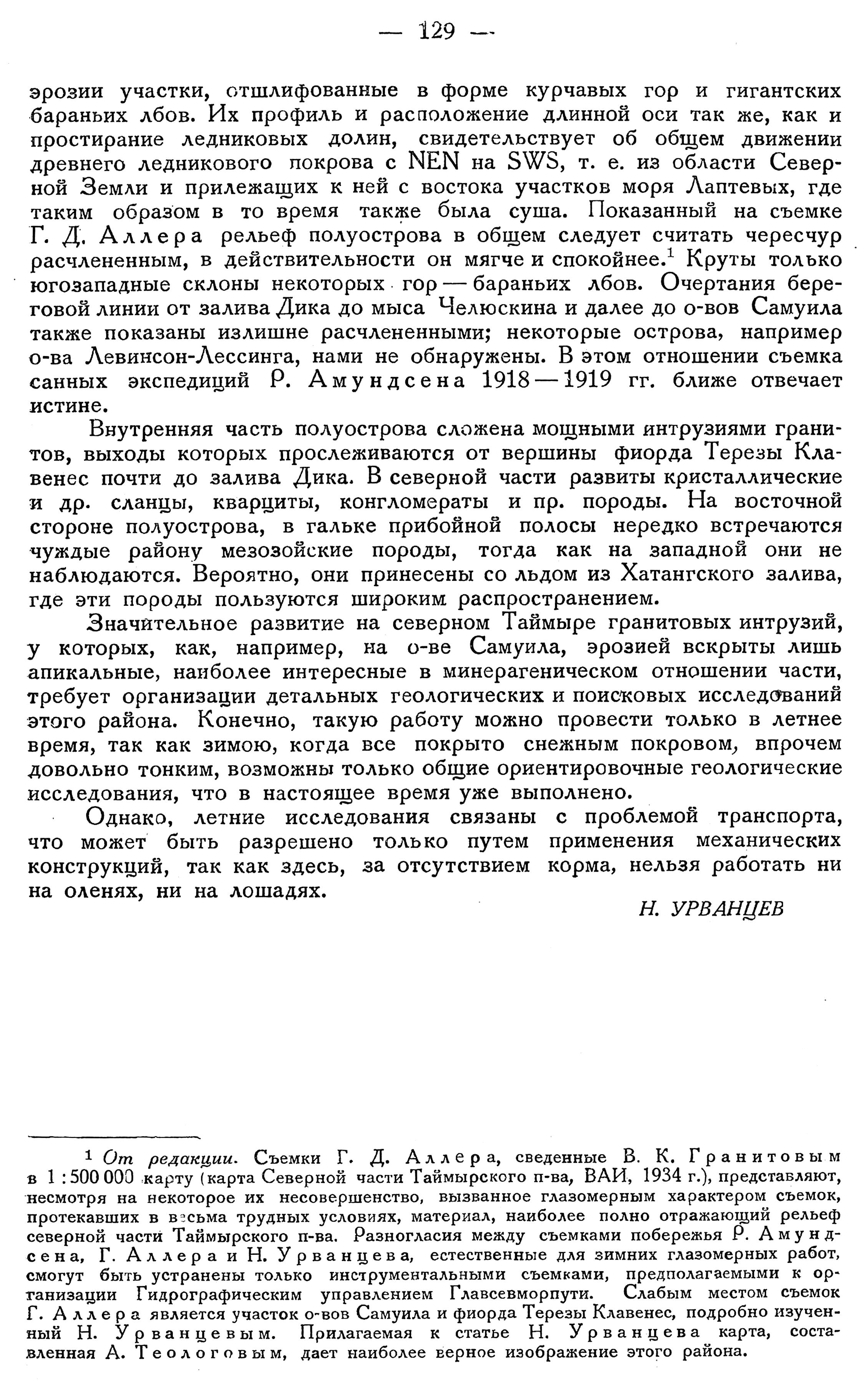 {1} От редакции. Съемки Г. Д. Аллера, сведенные В. К. Гранитовым в 1:500 000 карту (карта Северной части Таймырского п-ва, ВАИ, 1934 г.), представляют, несмотря на некоторое их несовершенство, вызванное глазомерным характером съемок, протекавших в весьма трудных условиях, материал, наиболее полно отражающий рельеф северной части Таймырского п-ва. Разногласия между съемками побережья Р. Амундсена, Г. Аллера и Н. Урванцева, естественные для зимних глазомерных работ, смогут быть устранены только инструментальными съемками, предполагаемыми к организации Гидрографическим управлением Главсевморпути. Слабым местом съемок Г. Аллера является участок о-вов Самуила и фиорда Терезы Клавенес, подробно изученный Н. Урванцевым. Прилагаемая к статье Н. Урванцева карта, составленная А. Теологовым, дает наиболее верное изображение этого района.