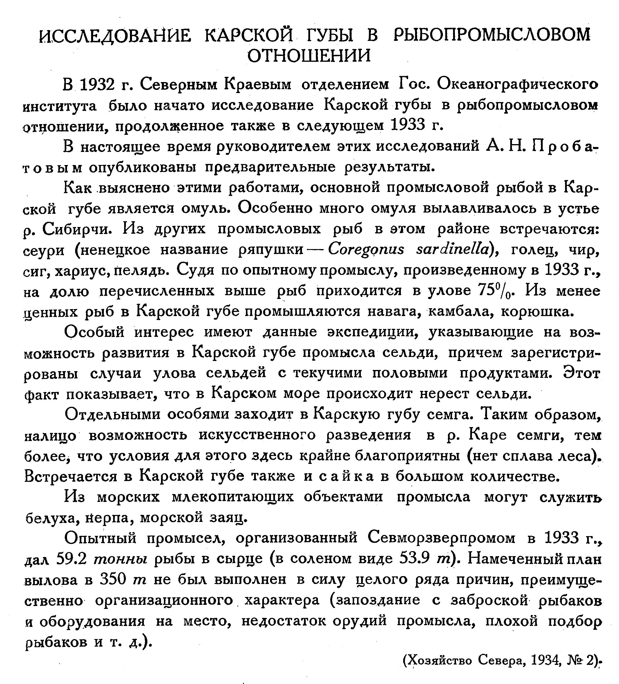 В 1932 г. Северным Краевым отделением Гос. Океанографического института было начато исследование Карской губы в рыбопромысловом отношении, продолженное также в следующем 1933 г.