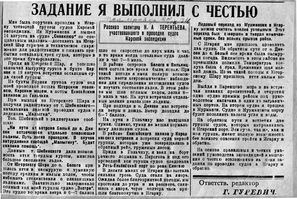 Рассказ капитана Н. А. ТЕРЕНТЬЕВА, участвовавшего в проводке судов Карской экспедиции