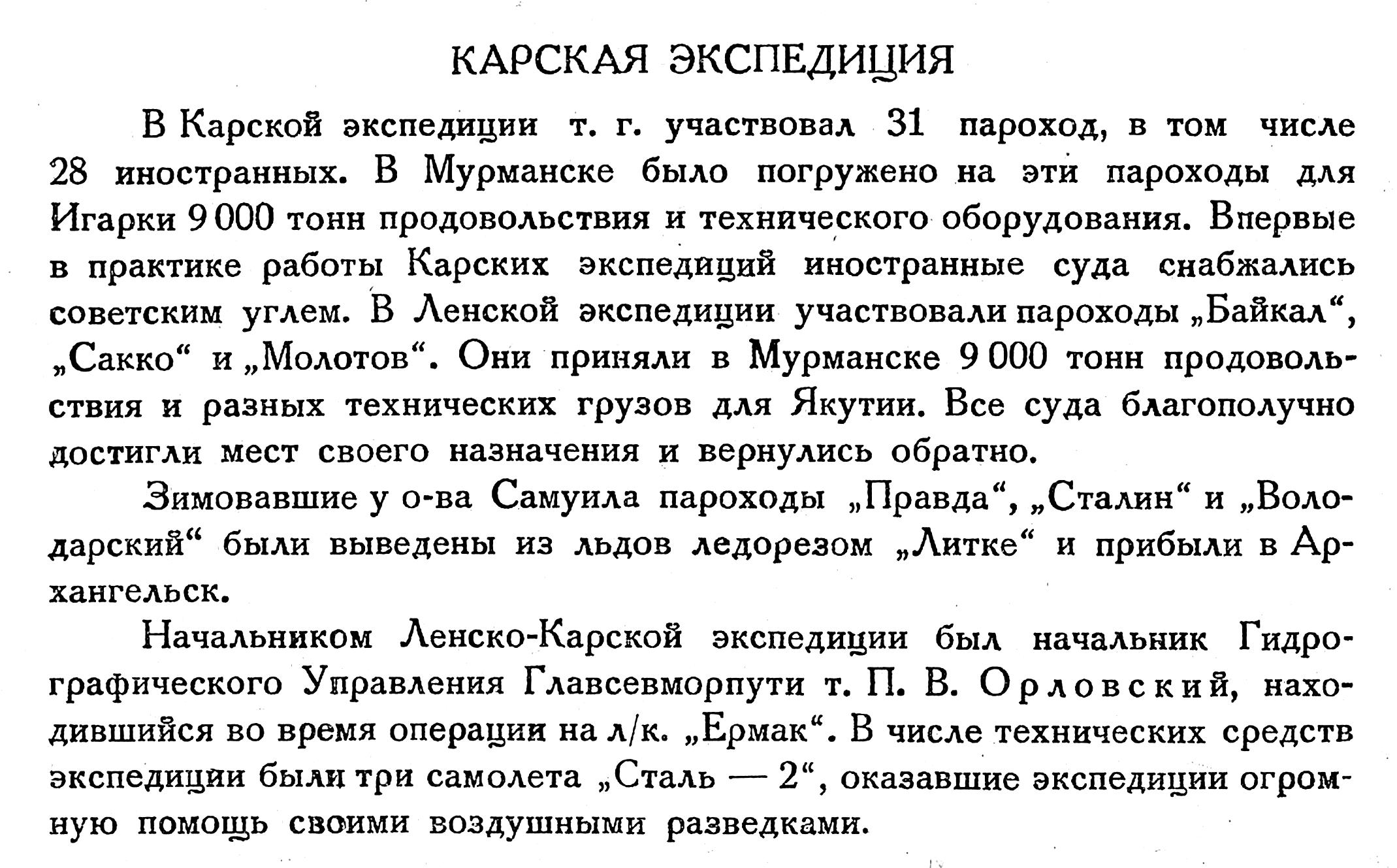 В Карской экспедиции т. г. участвовал 31 пароход, в том числе 28 иностранных. В Мурманске было погружено на эти пароходы для Игарки 9000 тонн продовольствия и технического оборудования. Впервые в практике работы Карских экспедиций иностранные суда снабжались советским углем. В Ленской экспедиции участвовали пароходы „Байкал", „Сакко" и „Молотов". Они приняли в Мурманске 9 000 тонн продовольствия и разных технических грузов для Якутии. Все суда благополучно достигли мест своего назначения и вернулись обратно.