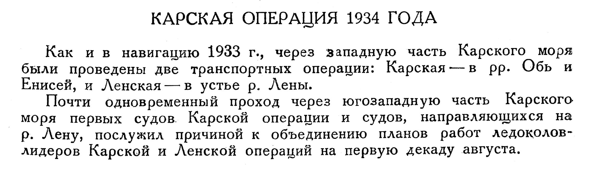 Как и в навигацию 1933 г., через западную часть Карского моря были проведены две транспортных операции: Карская — в pp. Обь и Енисей, и Ленская — в устье р. Лены.