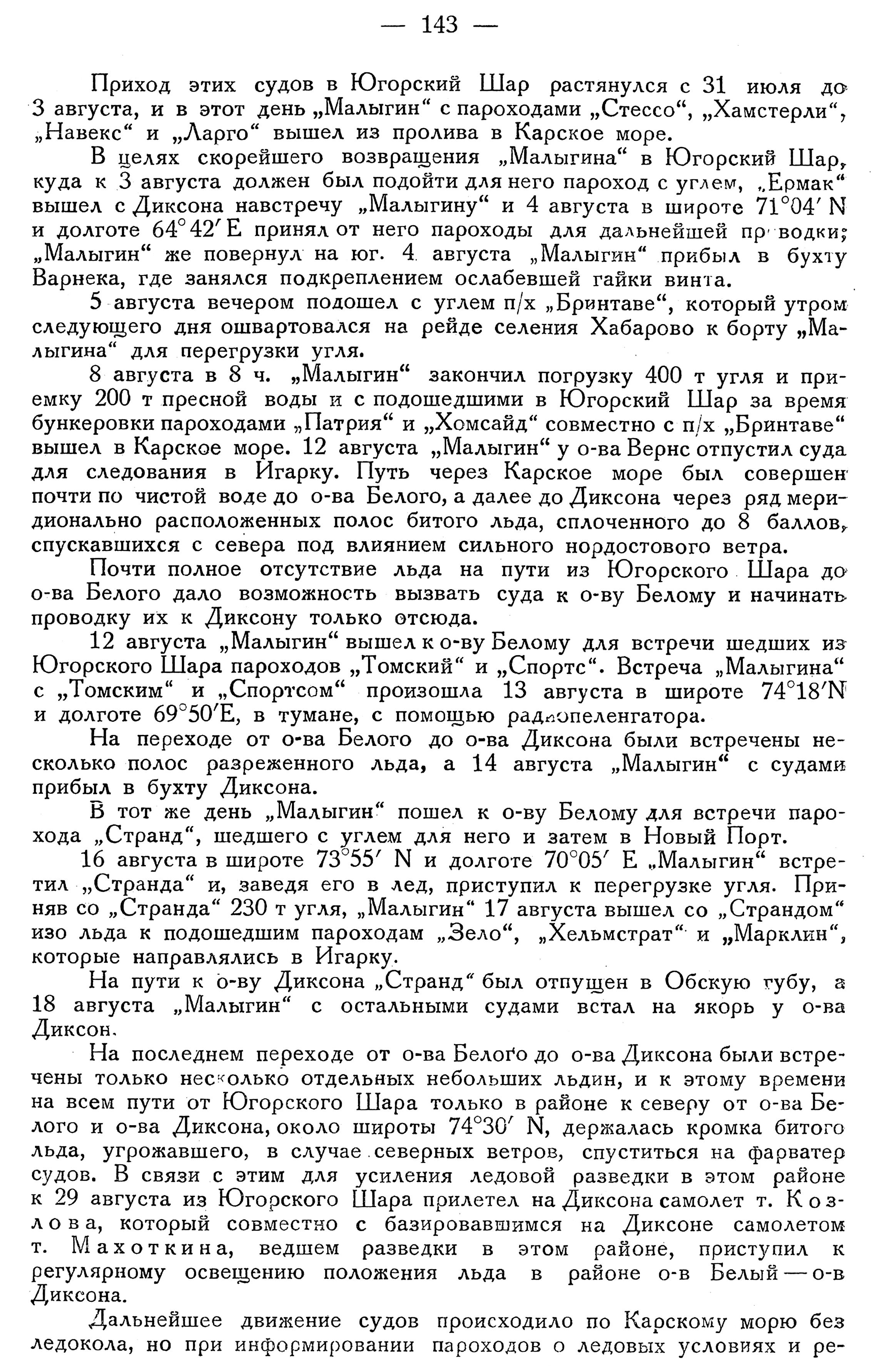 комендованных курсах следования с "Малыгина" по радио. За период с 20 по 30 августа через Югорский Шар в Енисейский залив последовательно прошли пароходы "Сивелюр", "Луиз Леонгард", "Варкворт" и "Экстранд", в Обскую губу п/х п/х "Грейтхоп", "Куйбышев", "Искра", а из бухты Диксона в Обскую губу прошел п/х "Томский" и в Енисейский залив п/х "Еуфорбия". За этот же период из Карского моря через Югорский Шар вышли п/х п/х "Невекс", "Ларго", "Стессо", "Хамстерлей", "Странд" и "Патрия". Все эти пароходы, за исключением шести уходивших из Карского моря, прошли чистой водой. Лед, встреченный этими пароходами, был на фарватере в районе о-ва Диксон — о-ва Белый и являлся следствием нажима льда северными ветрами.
