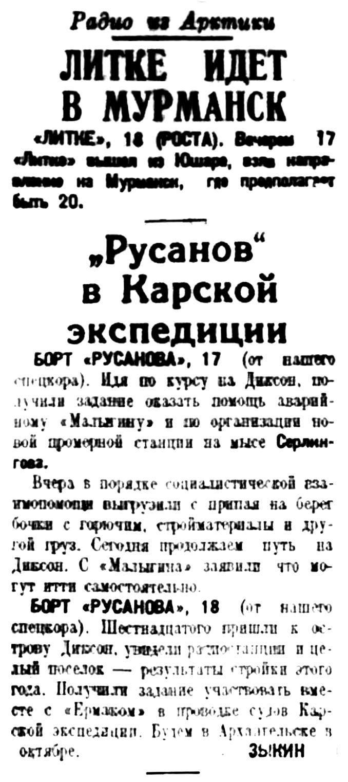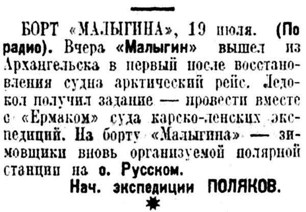 — Сегодня, в 8 часов вечера, ледокол "Малыгин" уходит из Архангельского порта к Новой Земле. На судне, кроме команды, — научная бригада по изучению сжатий льдов во главе с ученым Аля[д]бьевым, 4 зимовщика, едущих на остров Русский, 4 плотника для постройки радиостанции, 2 синоптика и 2 водолаза. На ледоколе едет штаб экспедиции.