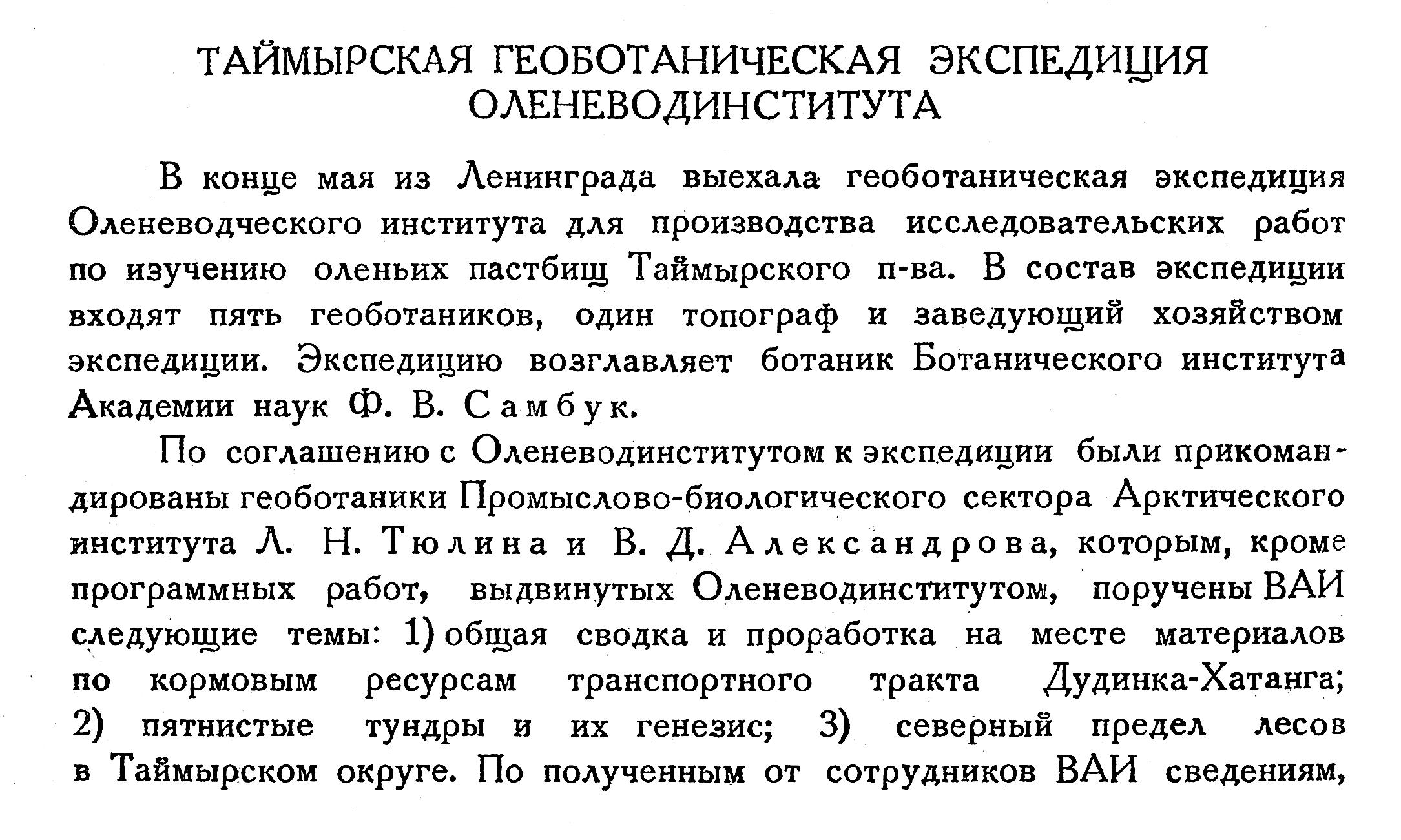 В конце мая из Ленинграда выехала геоботаническая экспедиция Оленеводческого института для производства исследовательских работ по изучению оленьих пастбищ Таймырского п-ва. В состав экспедиции входят пять геоботаников, один топограф и заведующий хозяйством экспедиции. Экспедицию возглавляет ботаник Ботанического института Академии наук Ф. В. Самбук.