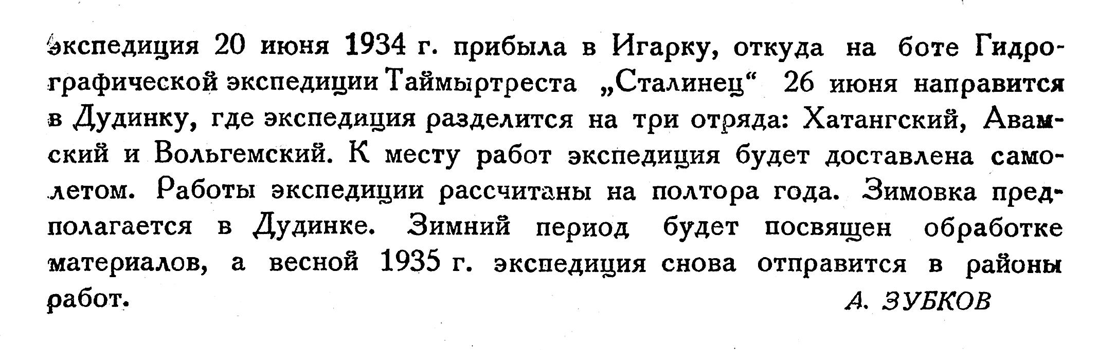 Экспедиция 20 июня 1934 г. прибыла в Игарку, откуда на боте Гидрографической экспедиции Таймыртреста „Сталинец" 26 июня направится в Дудинку, где экспедиция разделится на три отряда: Хатангский, Авамский и Вольгемский. К месту работ экспедиция будет доставлена самолетом. Работы экспедиции рассчитаны на полтора года. Зимовка предполагается в Дудинке. Зимний период будет посвящен обработке материалов, а весной 1935 г. экспедиция снова отправится в районы работ.
