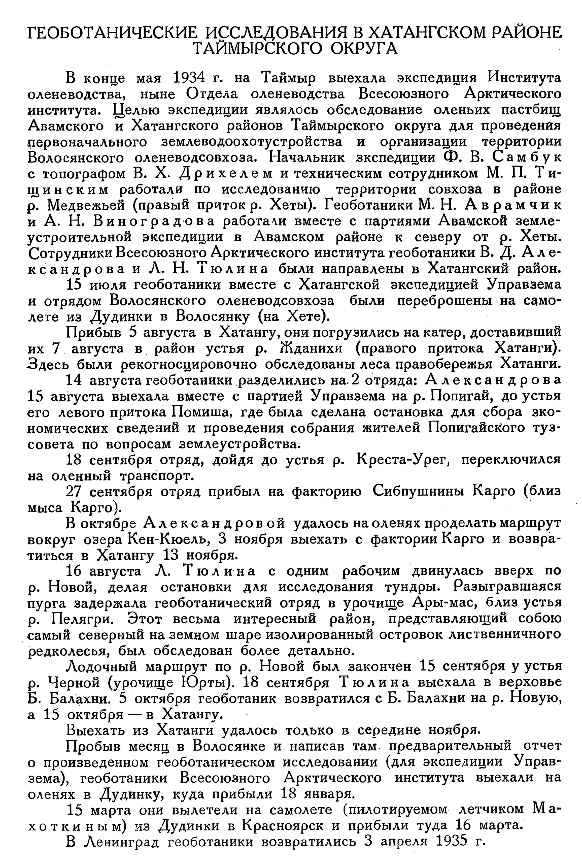В конце мая 1934 г. на Таймыр выехала экспедиция Института оленеводства, ныне Отдела оленеводства Всесоюзного Арктического института. Целью экспедиции являлось обследование оленьих пастбищ Авамского и Хатангского районов Таймырского округа для проведения первоначального землеводоохотустройства и организации территории Волосянского оленеводсовхоза. Начальник экспедиции Ф. В. Самбук с топографом В. X. Дрихелем и техническим сотрудником М. П. Тищинским работали по исследованию территории совхоза в районе р. Медвежьей (правый приток р. Хеты). Геоботаники М. Н. Аврамчик и А. Н. Виноградова работали вместе с партиями Авамской землеустроительной экспедиции в Авамском районе к северу от р. Хеты. Сотрудники Всесоюзного Арктического института геоботаники В. Д. Александрова и Л. Н. Тюлина были направлены в Хатангский район.