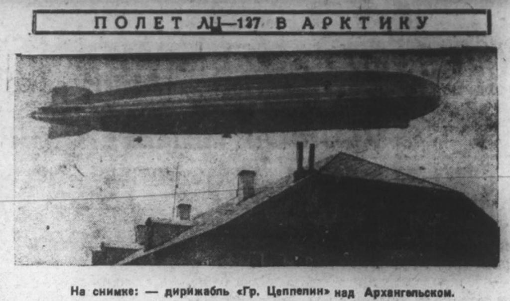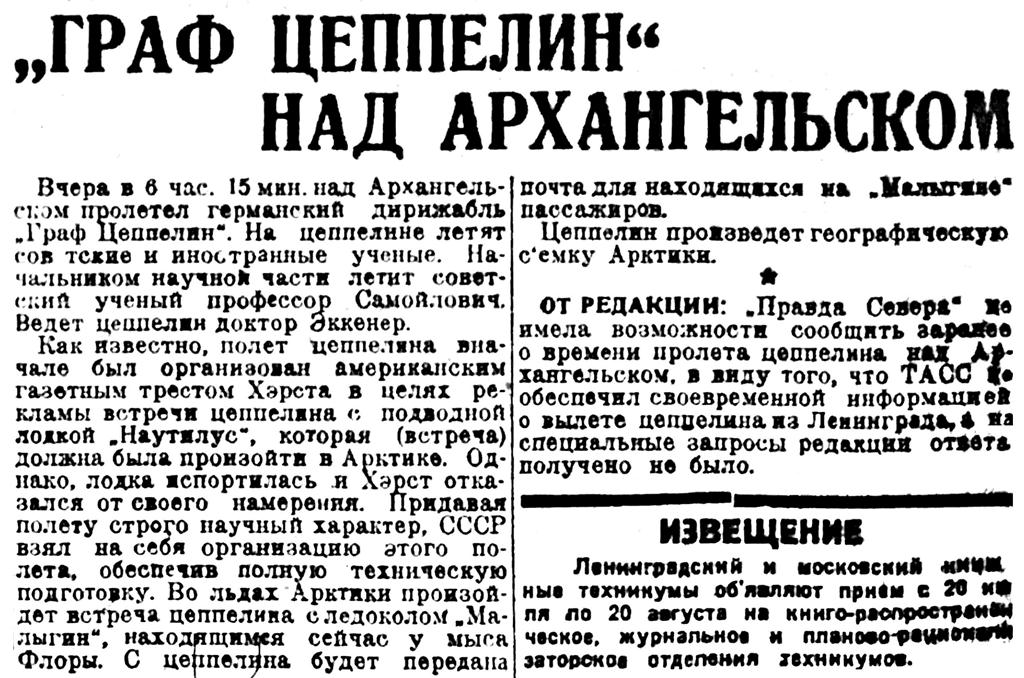 Вчера в 6 час. 15 мин. над Архангельском пролетел германский дирижабль "Граф Цеппелин". На цеппелине летят советские и иностранные ученые. Начальником научной части летит советский ученый профессор Самойлович. Ведет цеппелин доктор Эккенер.