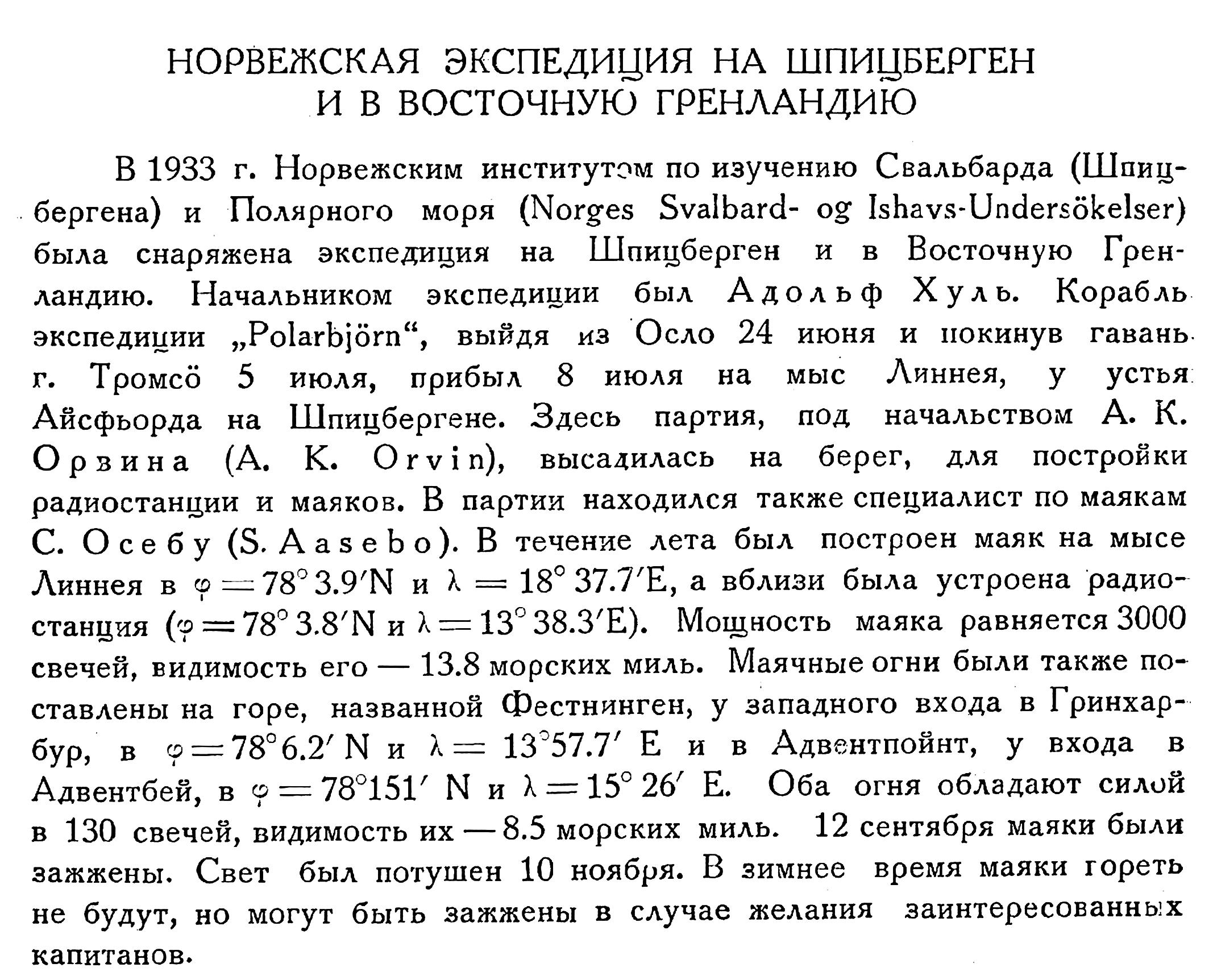 В 1933 г. Норвежским институтом по изучению Свальбарда (Шпицбергена) и Полярного моря (Norges Svalbard-og Ishavs-Undersokelser) была снаряжена экспедиция на Шпицберген и в Восточную Гренландию. Начальником экспедиции был Адольф Хуль. Корабль экспедиции „Polarbjörn", выйдя из Осло 24 июня и покинув гавань г. Тромсő 5 июля, прибыл 8 июля на мыс Линнея, у устья Айсфьорда на Шпицбергене. Здесь партия, под начальством А. К. Орвина (А. К. Orvin), высадилась на берег, для постройки радиостанции и маяков. В партии находился также специалист по маякам С. Осебу (S. Aasebo). В течение лета был построен маяк на мысе Линнея в φ=78°3.9' N и λ = 18°37.7' Е, а вблизи была устроена радиостанция (φ = 78°3.8' N и λ = 13°38.3' Е). Мощность маяка равняется 3000 свечей, видимость его — 13.8 морских миль. Маячные огни были также поставлены на горе, названной Фестнинген, у западного входа в Гринхарбур, в φ = 78°6.2' N и λ= 13°57.7' Е и в Адвентпойнт, у входа в Адвентбей, φ = 78°15.1' N и λ = 15°26' Е. Оба огня обладают силой в 130 свечей, видимость их — 8.5 морских миль. 12 сентября маяки были зажжены. Свет был потушен 10 ноября. В зимнее время маяки гореть не будут, но могут быть зажжены в случае желания заинтересованных капитанов.