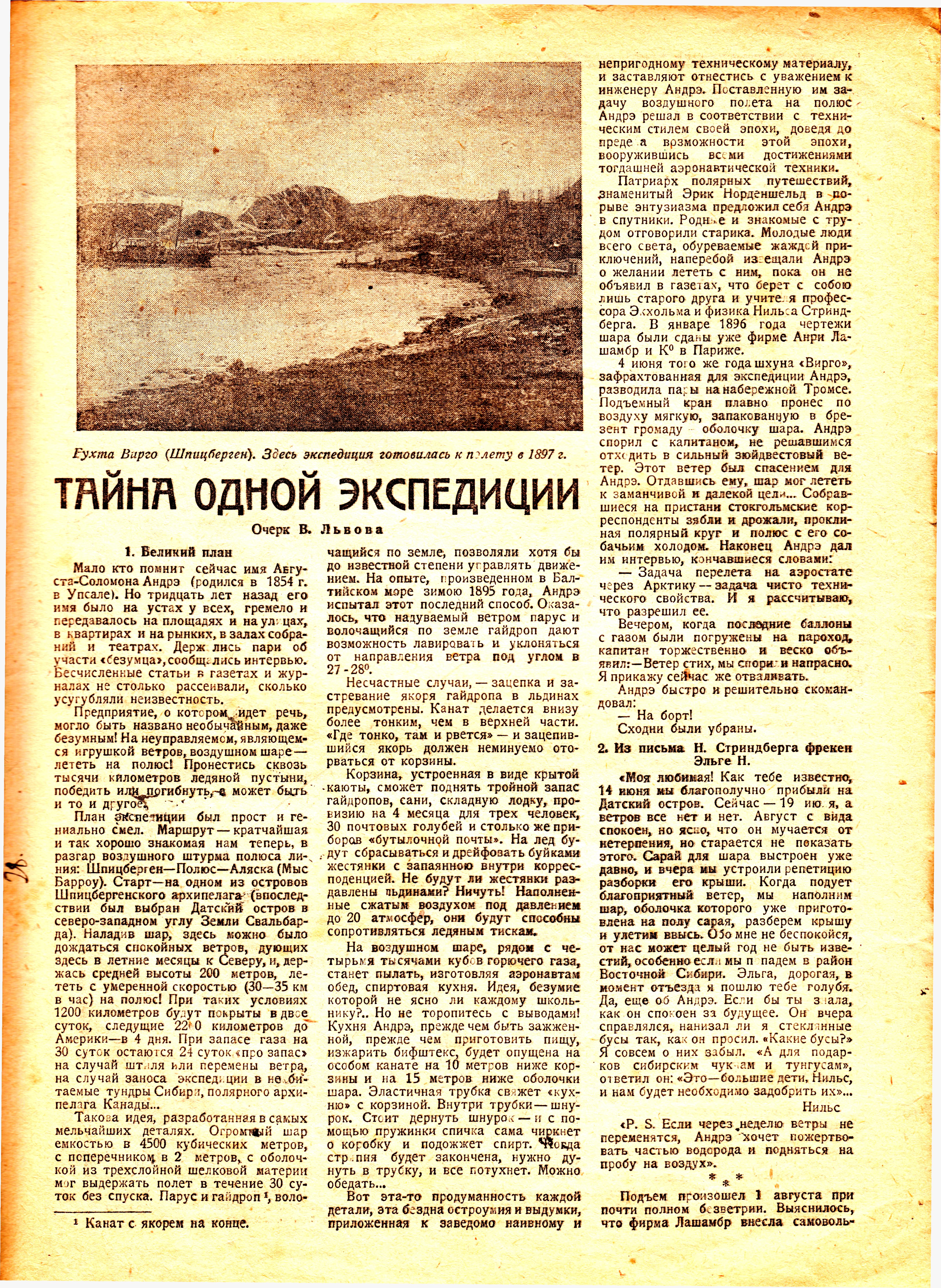 «В последнее время и печать и публика очень много занимались вопросом об участи знаменитого воздухоплавателя Андре. рискнувшего отправиться на воздушном шаре к неведомому до сих пор Северному полюсу... Напечатанное ниже начало дневника имеет, несомненно, громадное значение, так как дневник этот есть до сих пор единственный документ, взятый из реальной действительности, и по всем признакам принадлежал перу знаменитого воздухоплавателя».
