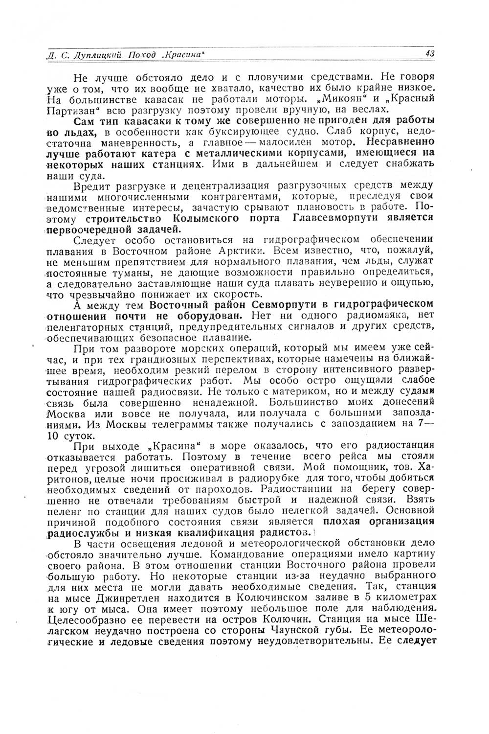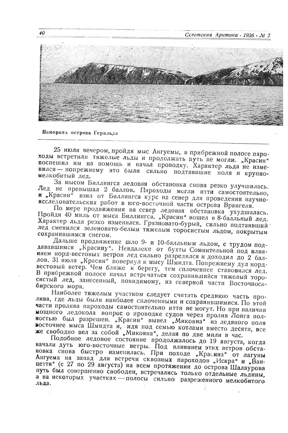 Донесения самолетов о состоянии льдов давали далеко неполное представление о ледовой обстановке. Сообщение о том, что между мысом Шмидта и Яканом в прибрежной полосе 7- или 8-балльный лед, очень мало дает мореплавателю. Необходимо подробное освещение наиболее трудных мест, перемычек, наибольшего сплочения льдов и конкретные указания, имеется ли проход и в каком направлении. Одним словом, летчик должен не только механически фиксировать общую картину, но давать конкретный материал полярному мореплавателю.