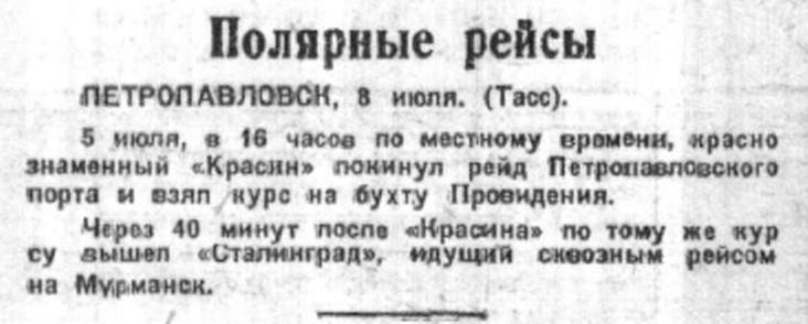 „Красин" встретился с „Анадырем" и „Сталинградом" в бухте Провидения 9 июля. Были приняты все меры, чтобы обеспечить плавание этих судов. „Красин" зорко наблюдал за их продвижением, следуя в непосредственной близости от них и запрашивая, нужна ли им помощь. Только после выхода их почти на чистую воду ледокол повернул к мысу Сердце-Камень для встречи судов Колымского рейса, проходивших в это время Берингов пролив. Плавание всех судов проходило вполне организованно и без перебоев.