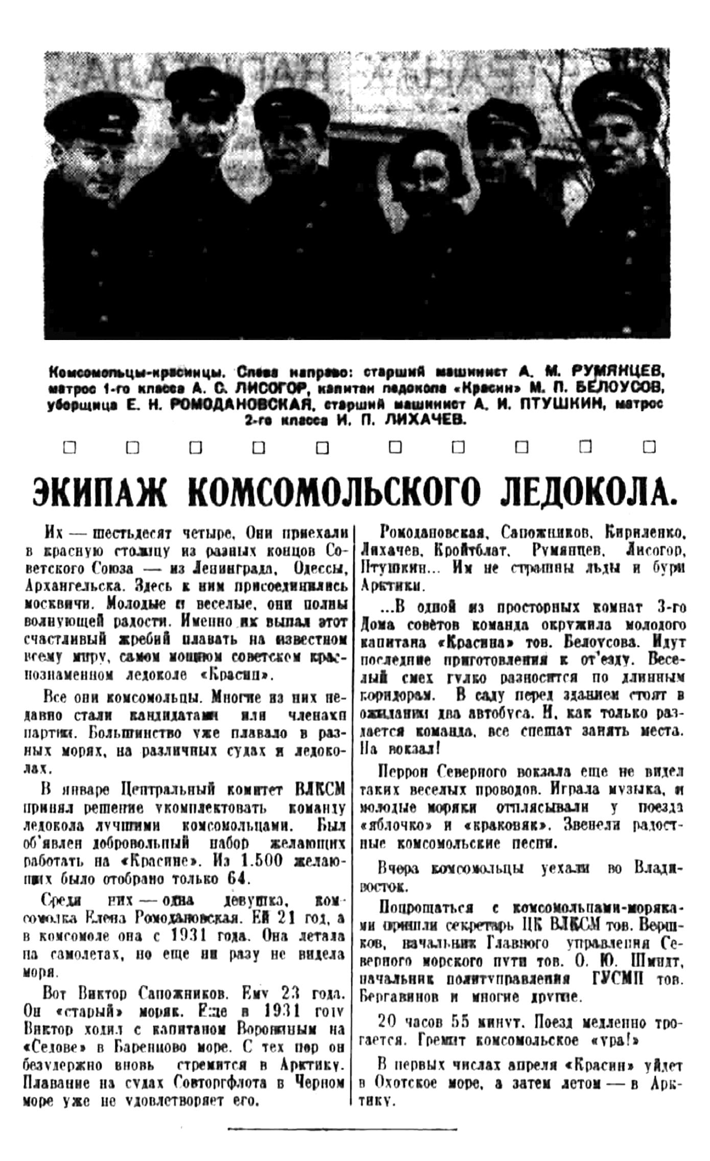 Комсомольцы-красинцы. Слева направо: старший машинист А. М. РУМЯНЦЕВ, матрос 1-го класса А. С. ЛИСОГОР, капитан ледокола "Красин" М. П. БЕЛОУСОВ, уборщица Е. Н. РОМОДАНОВСКАЯ, старший машинист А. И. ПТУШКИН, матрос 2-го класса И. П. ЛИХАЧЕВ.