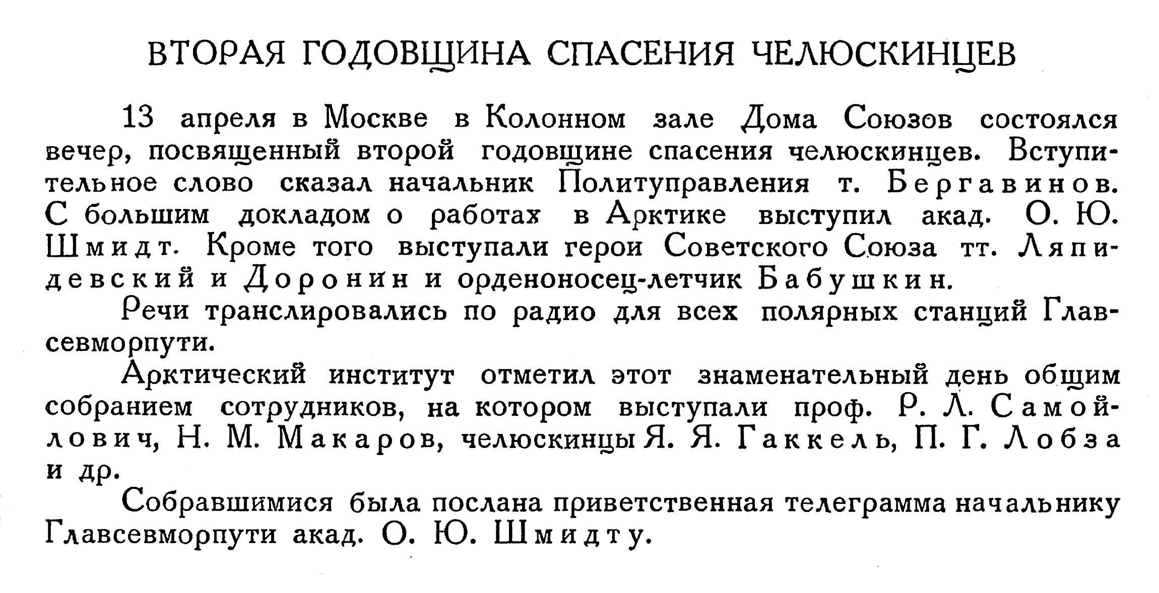 13 апреля в Москве в Колонном зале Дома Союзов состоялся вечер, посвященный второй годовщине спасения челюскинцев. Вступительное слово сказал начальник Политуправления т. Бергавинов. С большим докладом о работах в Арктике выступил акад. О. Ю. Шмидт. Кроме того выступали герои Советского Союза тт. Ляпидевский и Доронин и орденоносец-летчик Бабушкин.