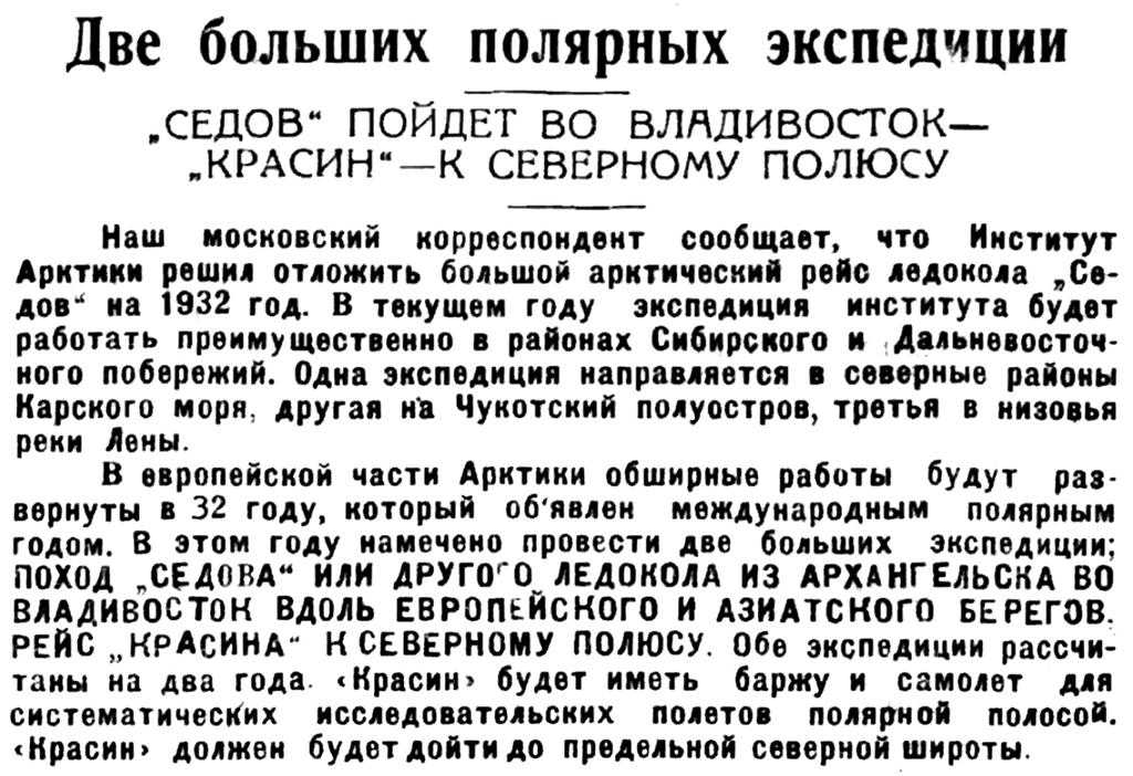 Наконец, арктический институт принимает участие международной экспедиции, которая будет проведена в этом году на дирижабле «Граф Цеппелин». Направление полета дирижабля — Земля Франца Иосифа, Северная Земля и обратно по Северной Сибири.