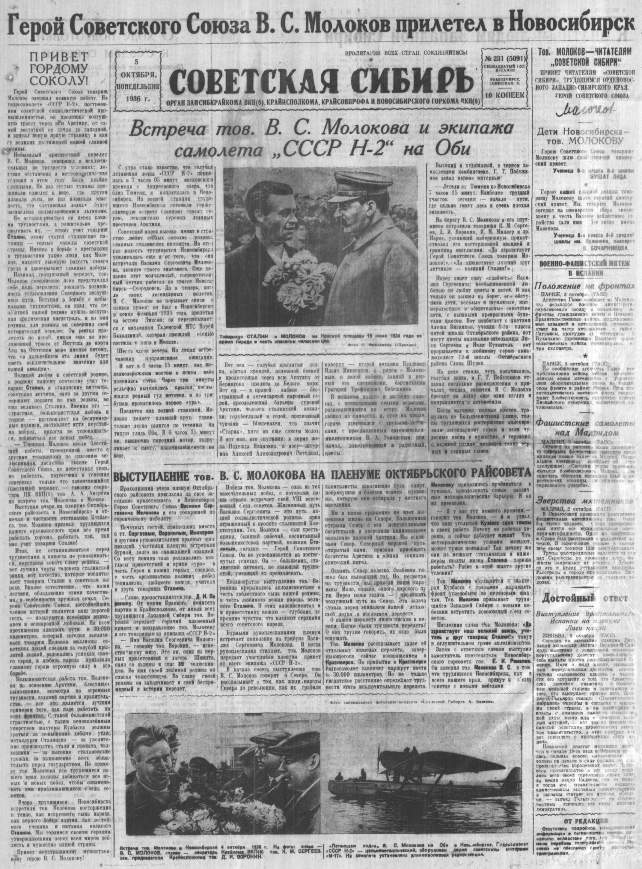 Советский народ высоко ценит и страстно любит гордых соколов родины, славных сталинских питомцев. На этот раз радость трудящихся Новосибирска усиливалась еще и от того, что они встречали Василия Сергоевича Молокова, давнего своего знакомого. Еще недавно этот молчаливый, сосредоточенный летчик работал на трассе Новосибирск — Свердловск. Да и теперь, после своих легендарных полетов. В. С. Молоков не прерывает связи с нашим краем: он был в Новосибирске в конце февраля 1935 года, пролетая на остров Диксон; он переписывается с механиком Талевской МТС Варей Бахолдиной, вторая прошлой осенью гостила у него в Москве.