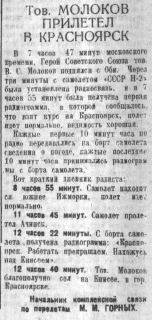 В 7 часов 47 минут московского времени, Герой Советского Союза тов. В. С. Молоков поднялся с Оби. Через три минуты с самолетом «СССР Н-2» была установлена радиосвязь, и в 7 часов 55 минут была получена первая радиограмма, в которой сообщалось, что взят курс на Красноярск, полет идет нормально, видимость хорошая.