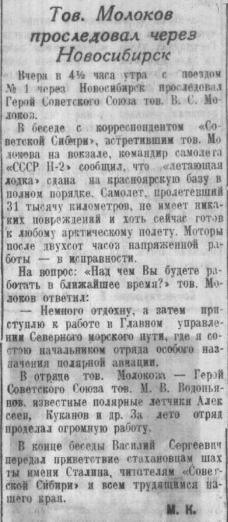 В беседе с корреспондентом «Советской Сибири», встретившим тов. Молокова на вокзале, командир самолета «СССР Н-2» сообщил, что «летающая лодка» сдана на красноярскую базу в полном порядке. Самолет, пролетевший 31 тысячу километров, не имеет никаких повреждений и хоть сейчас готов к любому арктическому полету. Моторы после двухсот часов напряженной работы — в исправности.