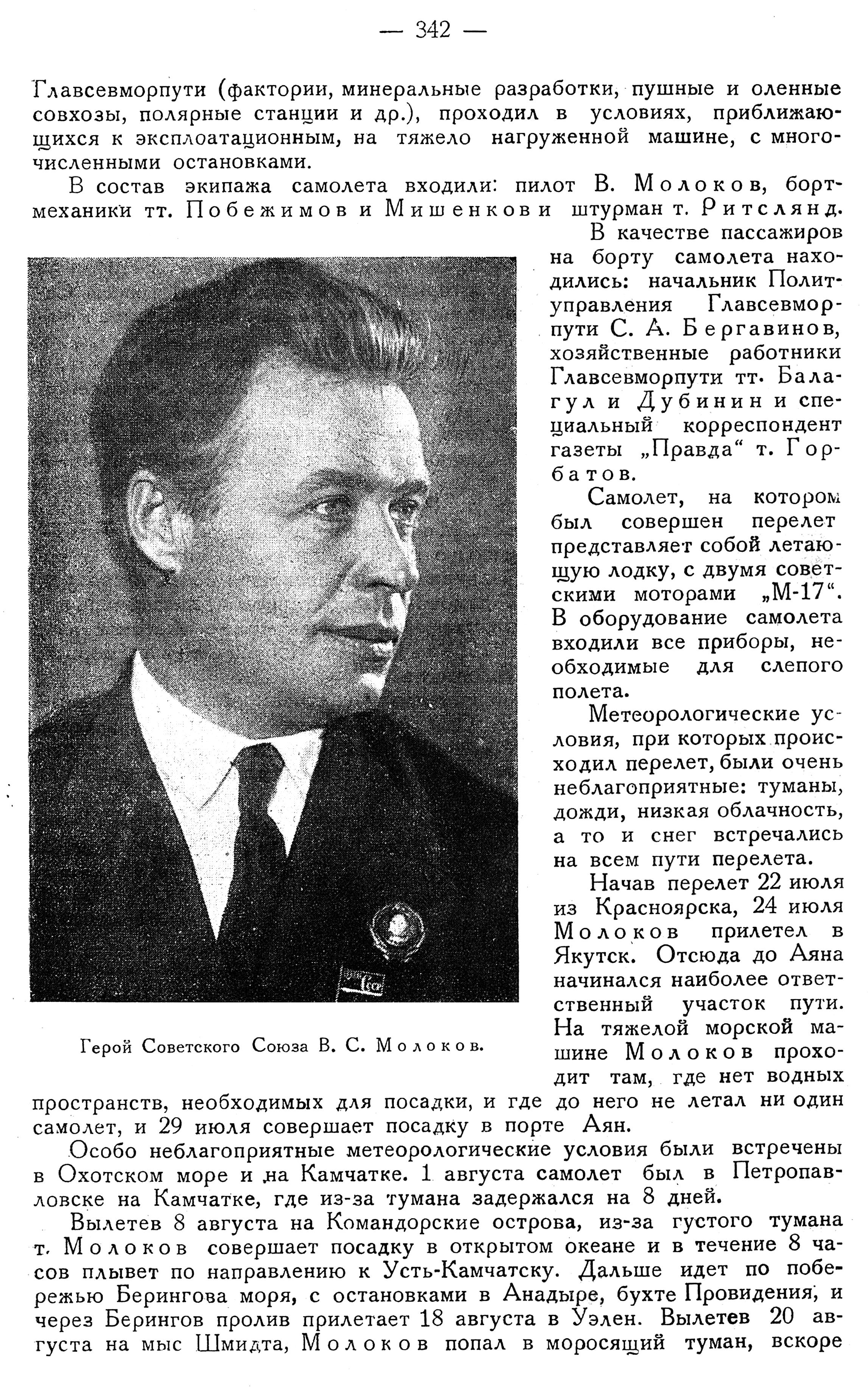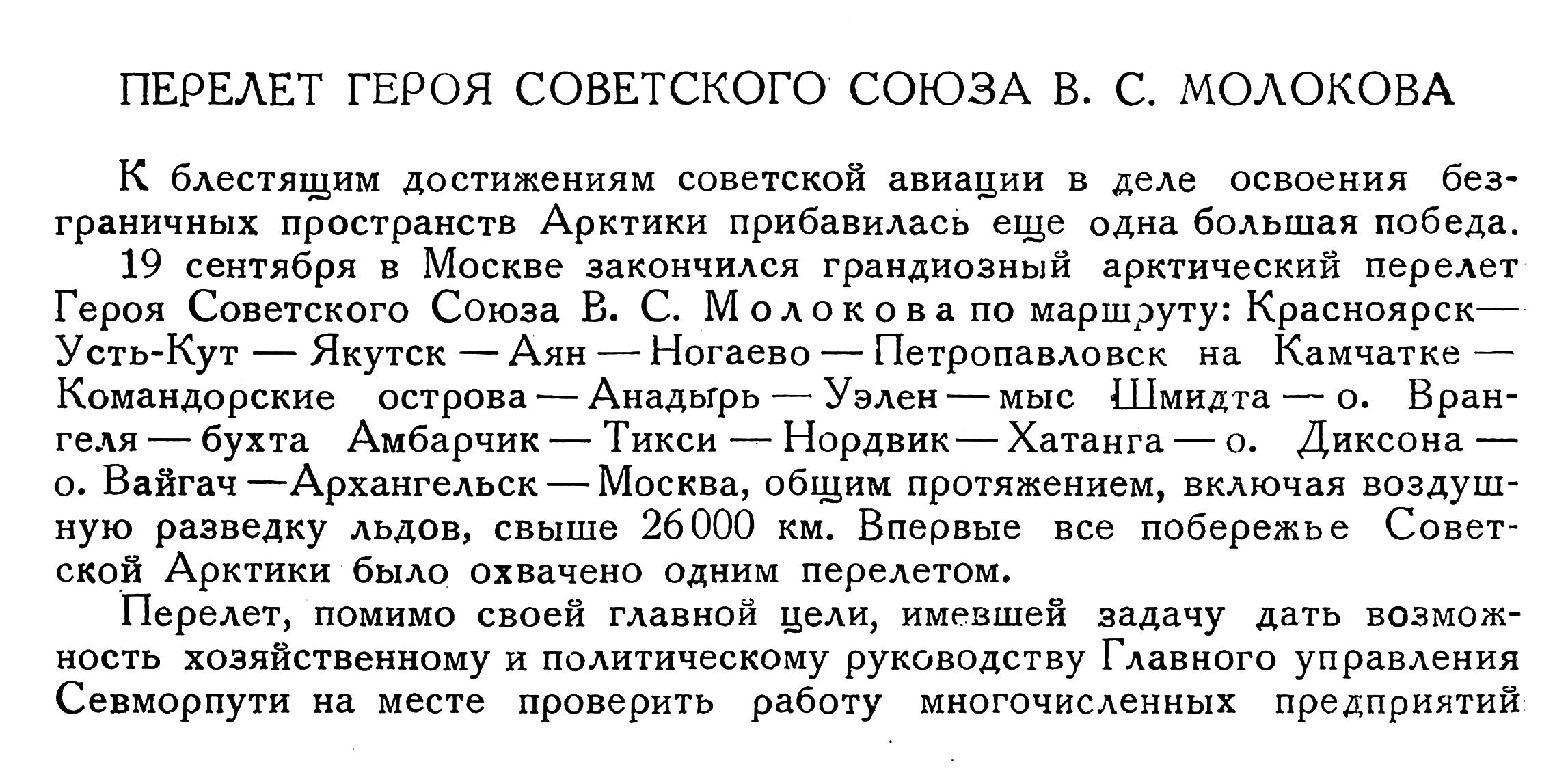 19 сентября в Москве закончился грандиозный арктический перелет Героя Советского Союза В. С. Молокова по маршруту: Красноярск — Усть-Кут — Якутск — Аян — Ногаево — Петропавловск на Камчатке — Командорские острова — Анадырь — Уэлен — мыс Шмидта — о. Врангеля — бухта Амбарчик — Тикси — Нордвик — Хатанга — о. Диксона — о. Вайгач — Архангельск — Москва, общим протяжением, включая воздушную разведку льдов, свыше 26000 км. Впервые все побережье Советской Арктики было охвачено одним перелетом.