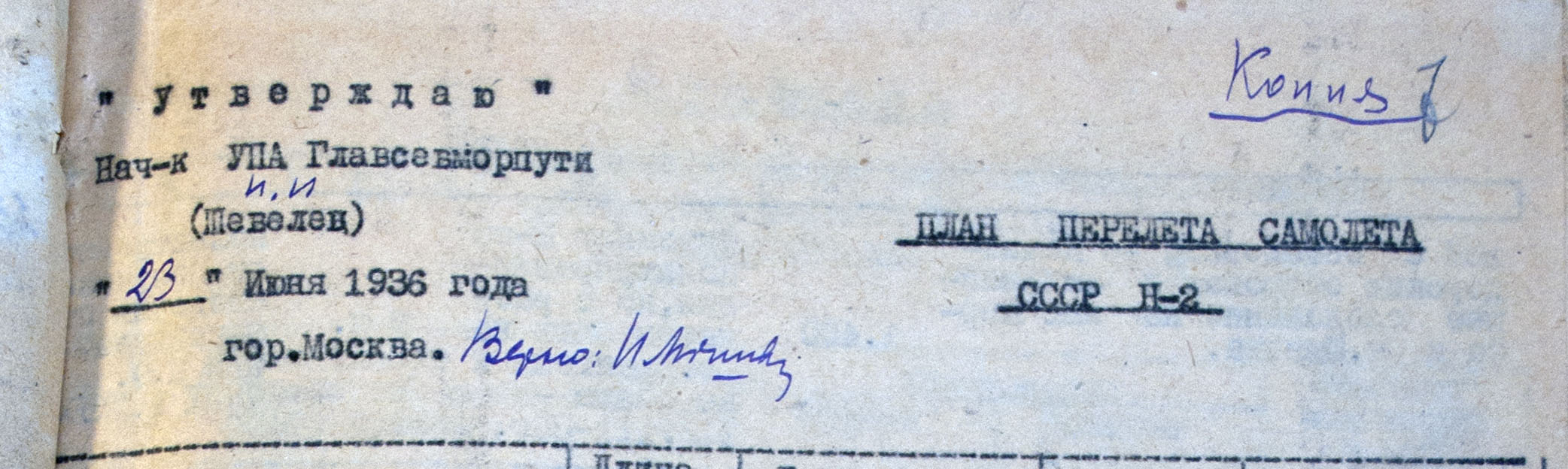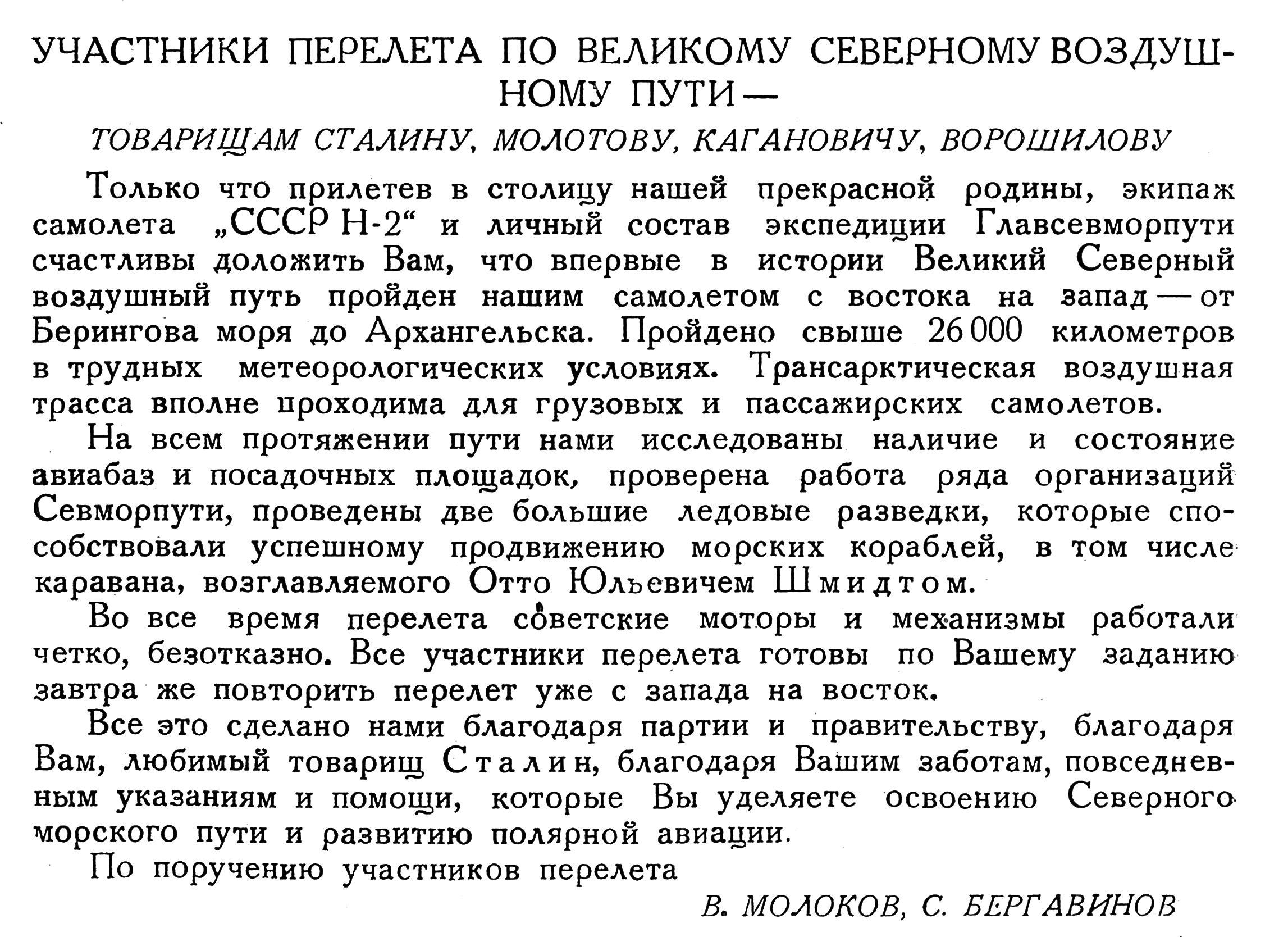 Только что прилетев в столицу нашей прекрасной родины, экипаж самолета „СССР Н-2" и личный состав экспедиции Главсевморпути счастливы доложить Вам, что впервые в истории Великий Северный воздушный путь пройден нашим самолетом с востока на запад — от Берингова моря до Архангельска. Пройдено свыше 26000 километров в трудных метеорологических условиях. Трансарктическая воздушная трасса вполне проходима для грузовых и пассажирских самолетов.