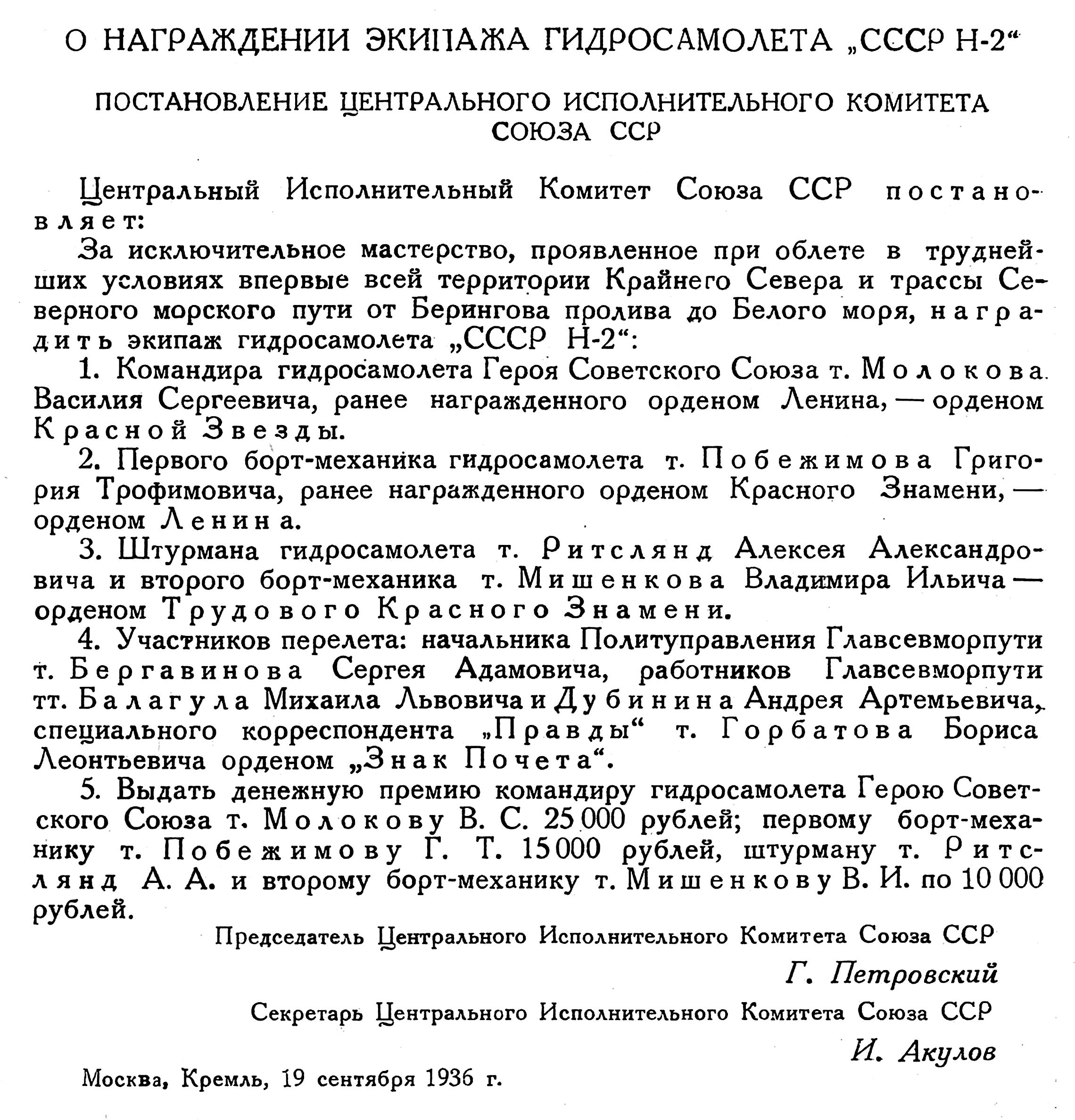 За исключительное мастерство, проявленное при облете в труднейших условиях впервые всей территории Крайнего Севера и трассы Северного морского пути от Берингова пролива до Белого моря, наградить экипаж гидросамолета „СССР Н-2“: