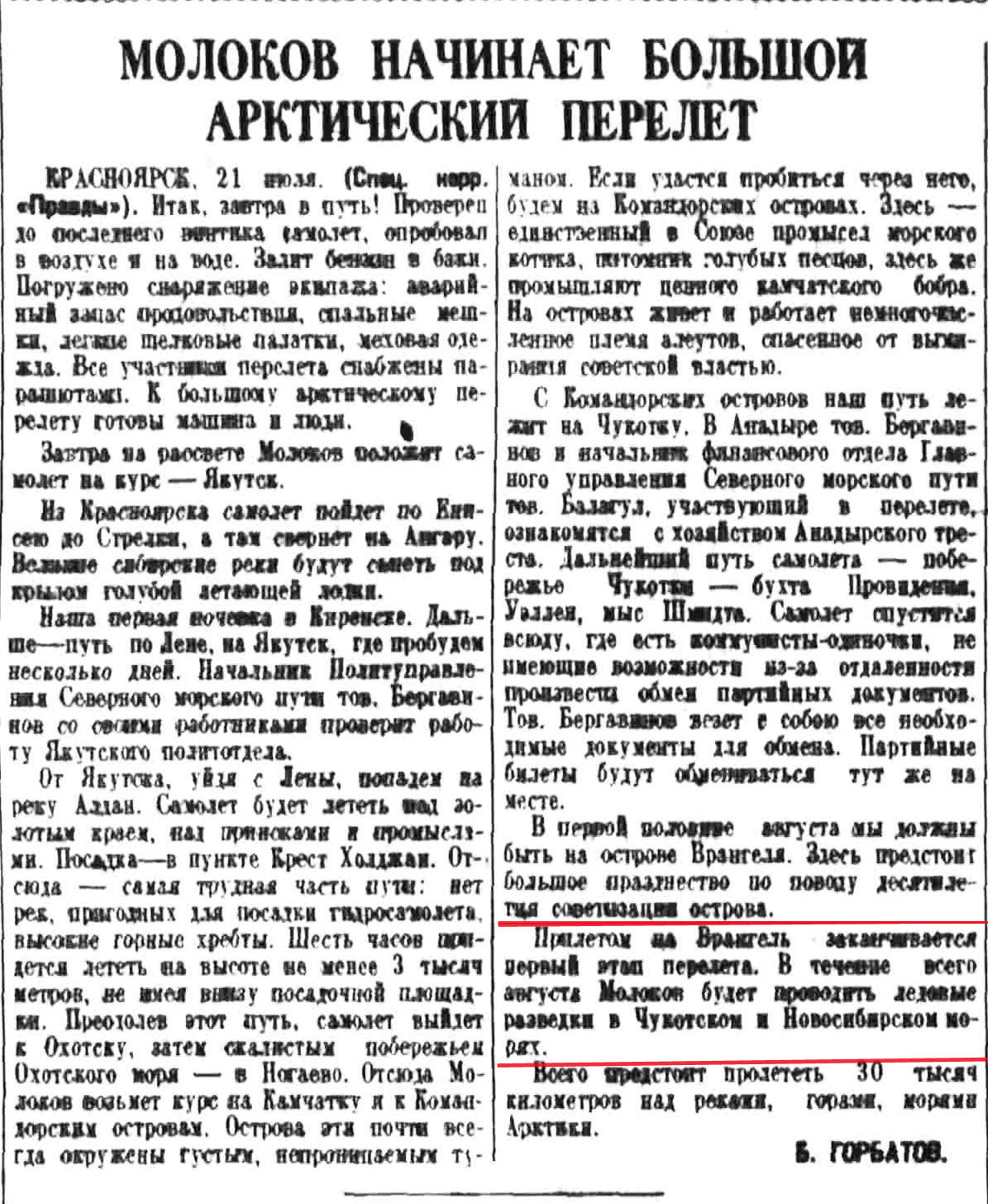 вот складывается впечатление, что не должен был Молоков изначально в Архангельск лететь, а должен был повторить полет 1935 года, но с заходом через Камчатку - Чукотку. Для Известий хронику полета как спецкор писал Дубинин. Известия №170 23-07-1936