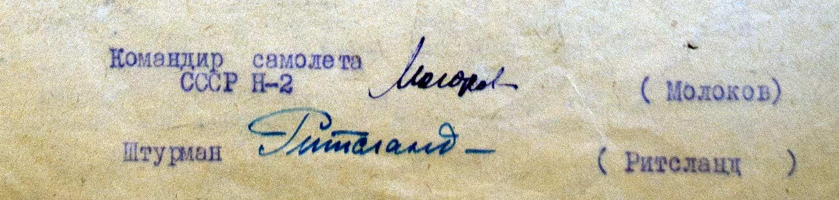 В состав экипажа самолета входили: пилот В. Молоков, бортмеханики тт. Побежимов и Мишенков и штурман т. Ритслянд.