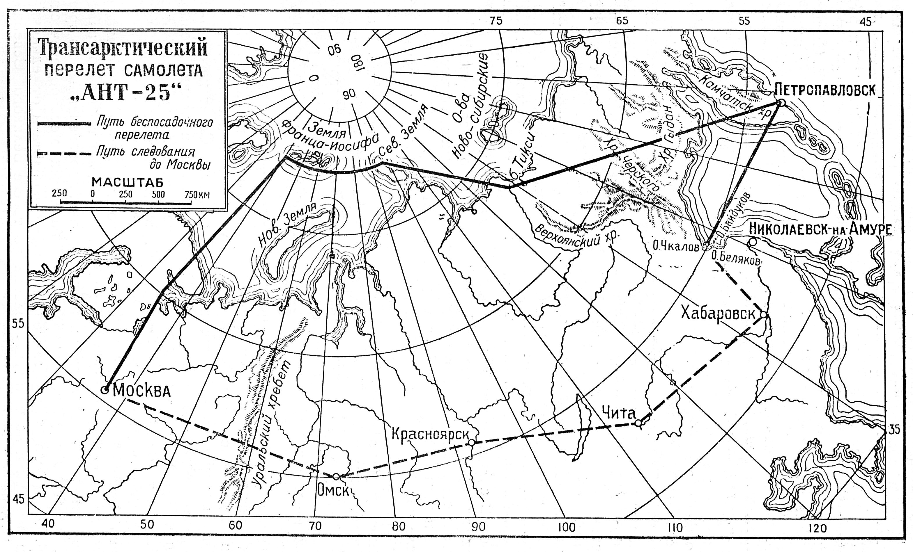 По неизученной трассе, в труднейших метеорологических условиях, советский самолет "АНТ-25", спроектированный и построенный силами Центрального Аэрогидродинамического института (ЦАГИ), под управлением первого пилота орденоносца