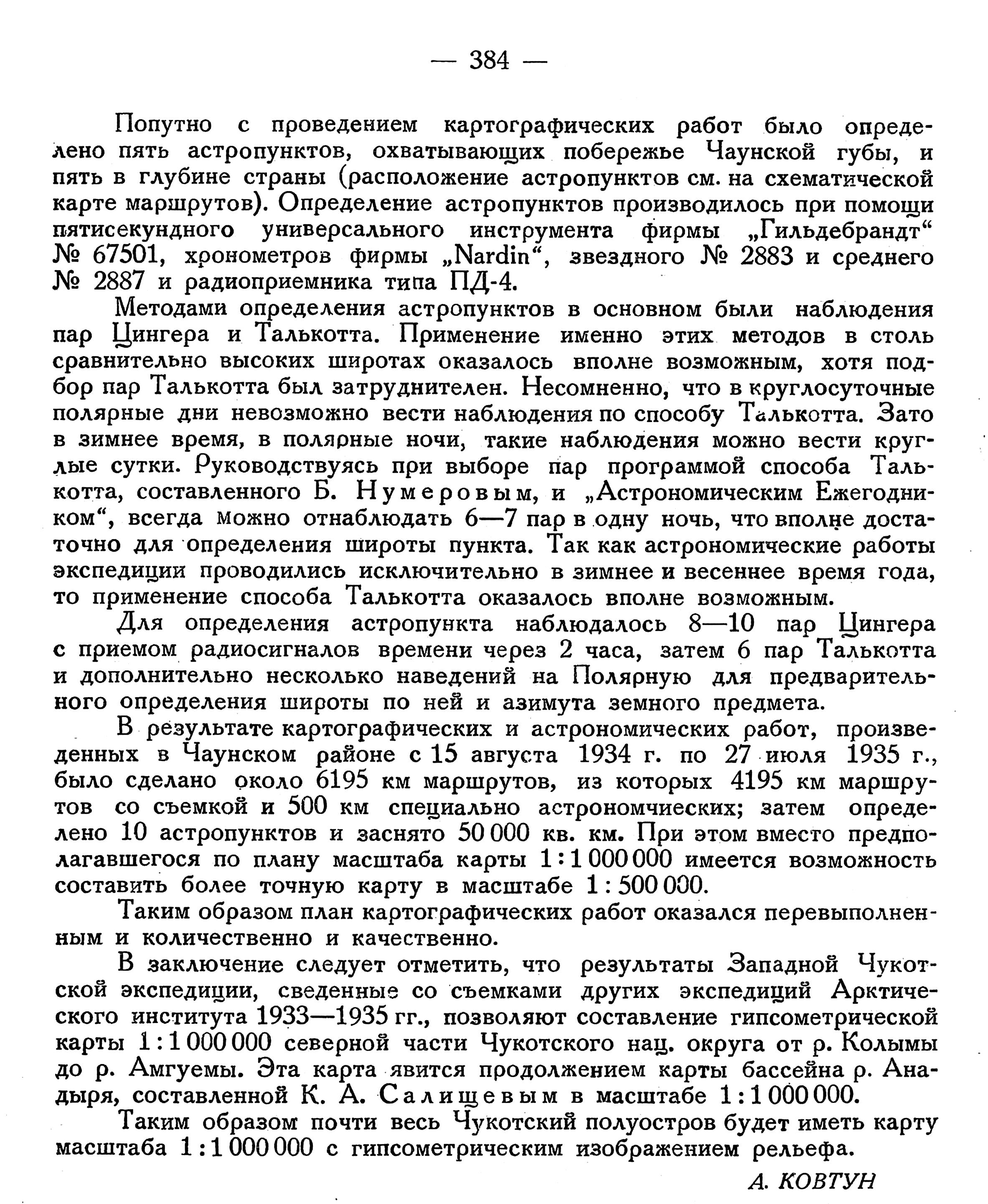 Методами определения астропунктов в основном были наблюдения пар Цингера и Талькотта. Применение именно этих методов в столь сравнительно высоких широтах оказалось вполне возможным, хотя подбор пар Талькотта был затруднителен. Несомненно, что в круглосуточные полярные дни невозможно вести наблюдения по способу Талькотта. Зато в зимнее время, в полярные ночи, такие наблюдения можно вести круглые сутки. Руководствуясь при выборе пар программой способа Талькотта, составленного Б. Нумеровым, и „Астрономическим Ежегодником", всегда можно отнаблюдать 6—7 пар в одну ночь, что вполне достаточно для определения широты пункта. Так как астрономические работы экспедиции проводились исключительно в зимнее и весеннее время года, то применение способа Талькотта оказалось вполне возможным.