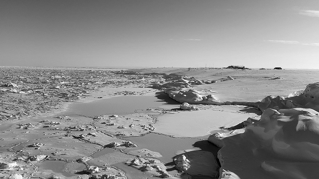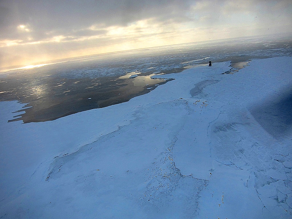 Сразу по береговой линии наблюдаю участки торошения льда и открытой воды.