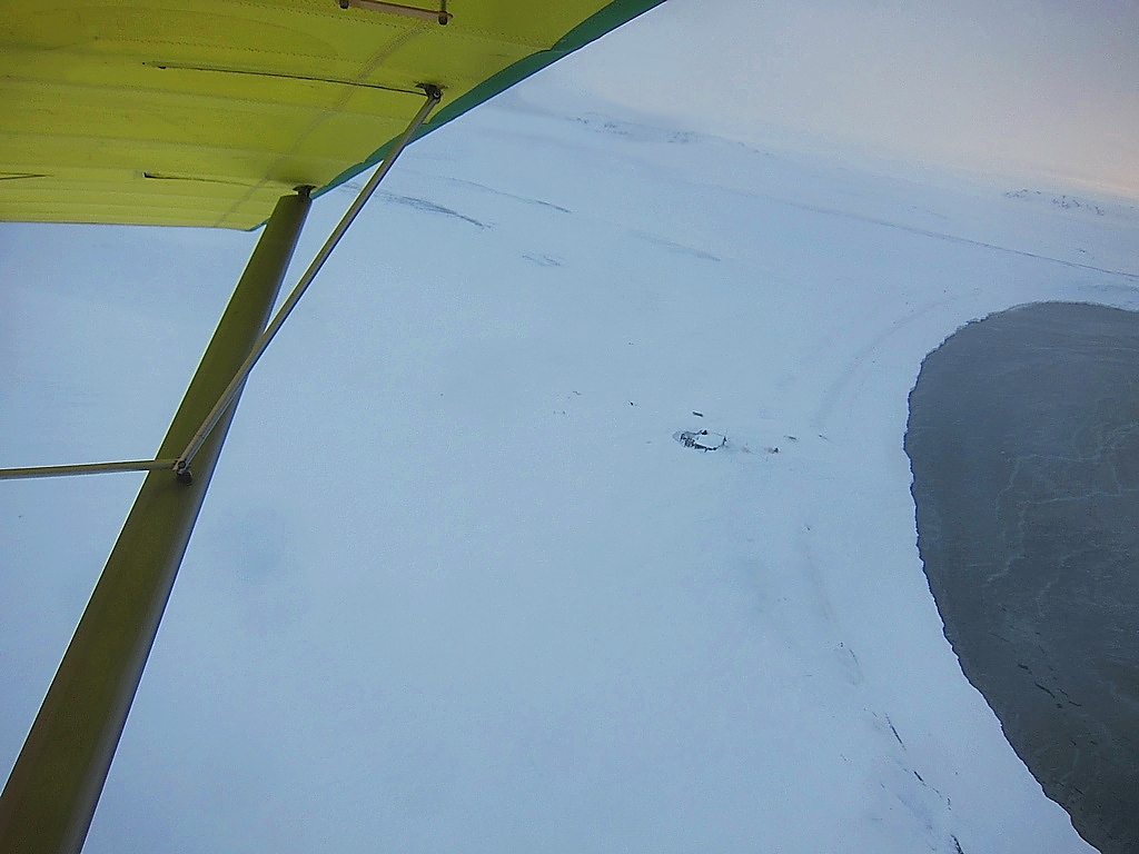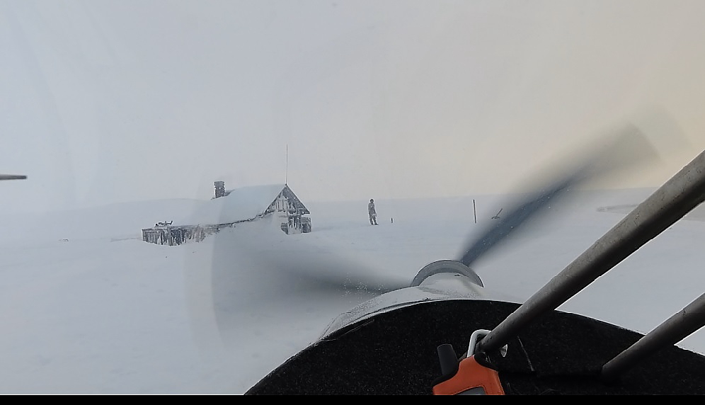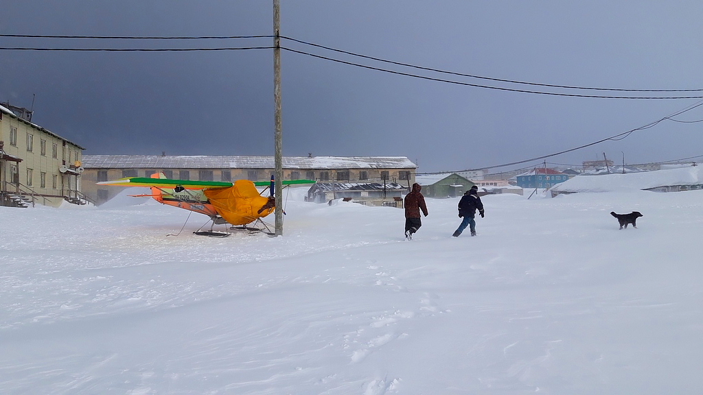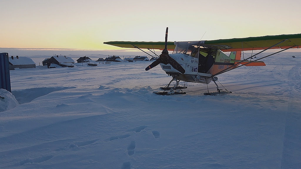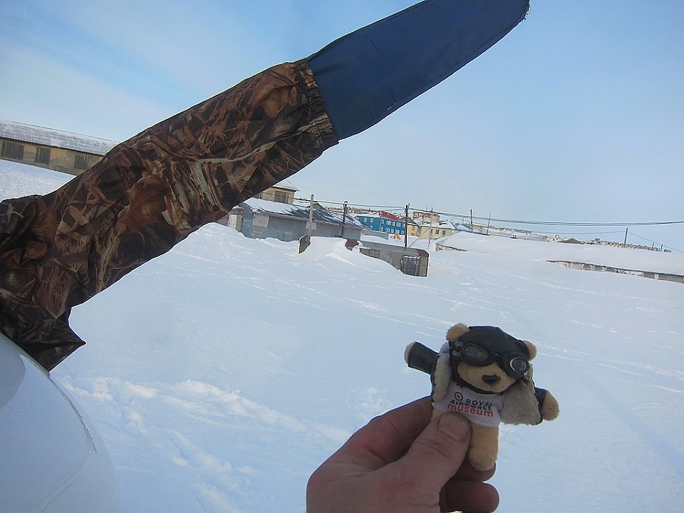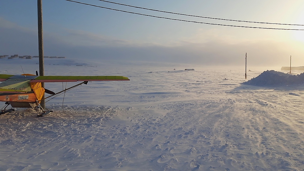 На улице похолодало до минус 13 градусов, я начал готовить самолет с 10 часов и очень помог снегоход Ивана Петровича. Вначале я Бураном закрыл Северок от ветра, пока грел примусом двигатель, а после уже оттащил самолет веревкой на вылет. В магазинчик заехал попрощался с Еленой Юльевной и вместе с Петровичем поехали к самолету. Тут и состоялось одно из самых замечательных событий этой экспедиции. Вспоминаю как в декабре из-за сложной погоды я не смог взять в полет с собой Петровича и насколько он был расстроен.