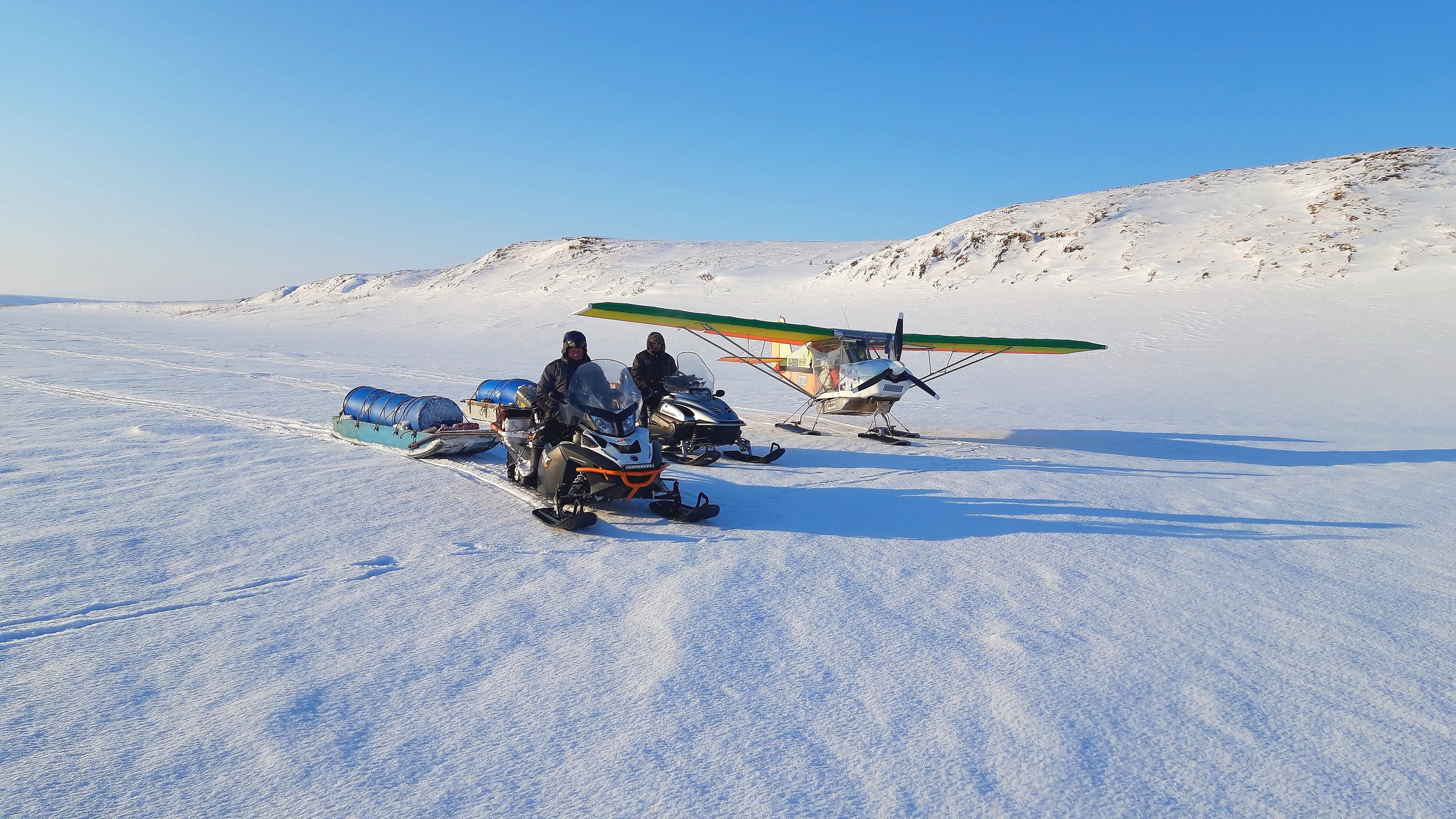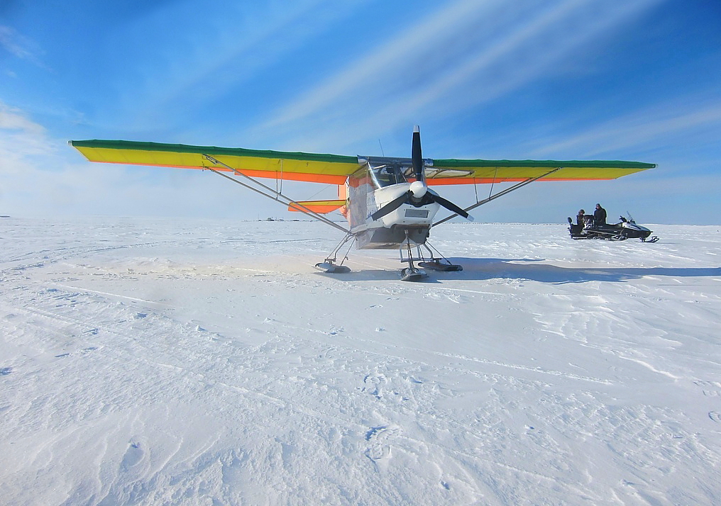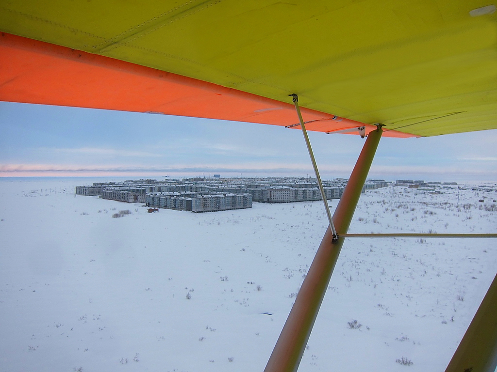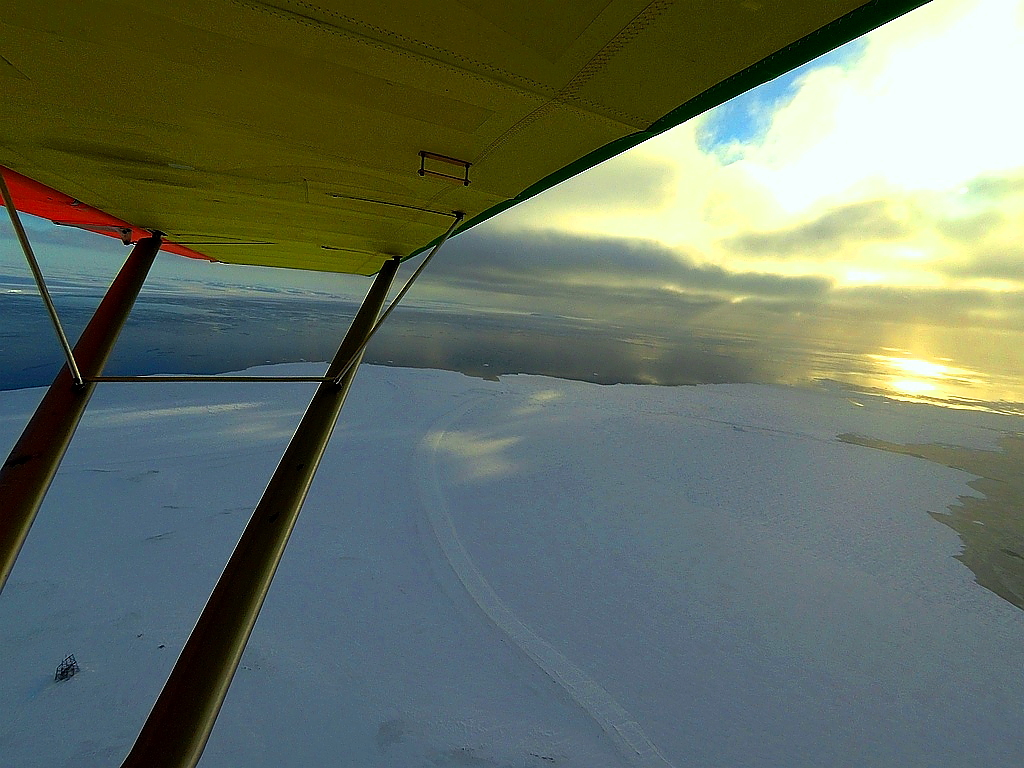 На улице похолодало до минус 13 градусов, я начал готовить самолет с 10 часов и очень помог снегоход Ивана Петровича. Вначале я Бураном закрыл Северок от ветра, пока грел примусом двигатель, а после уже оттащил самолет веревкой на вылет. В магазинчик заехал попрощался с Еленой Юльевной и вместе с Петровичем поехали к самолету. Тут и состоялось одно из самых замечательных событий этой экспедиции. Вспоминаю как в декабре из-за сложной погоды я не смог взять в полет с собой Петровича и насколько он был расстроен.